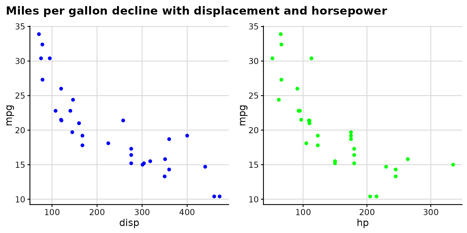p1 <- ggplot(mtcars, aes(disp, mpg)) +