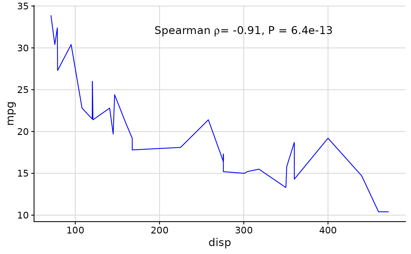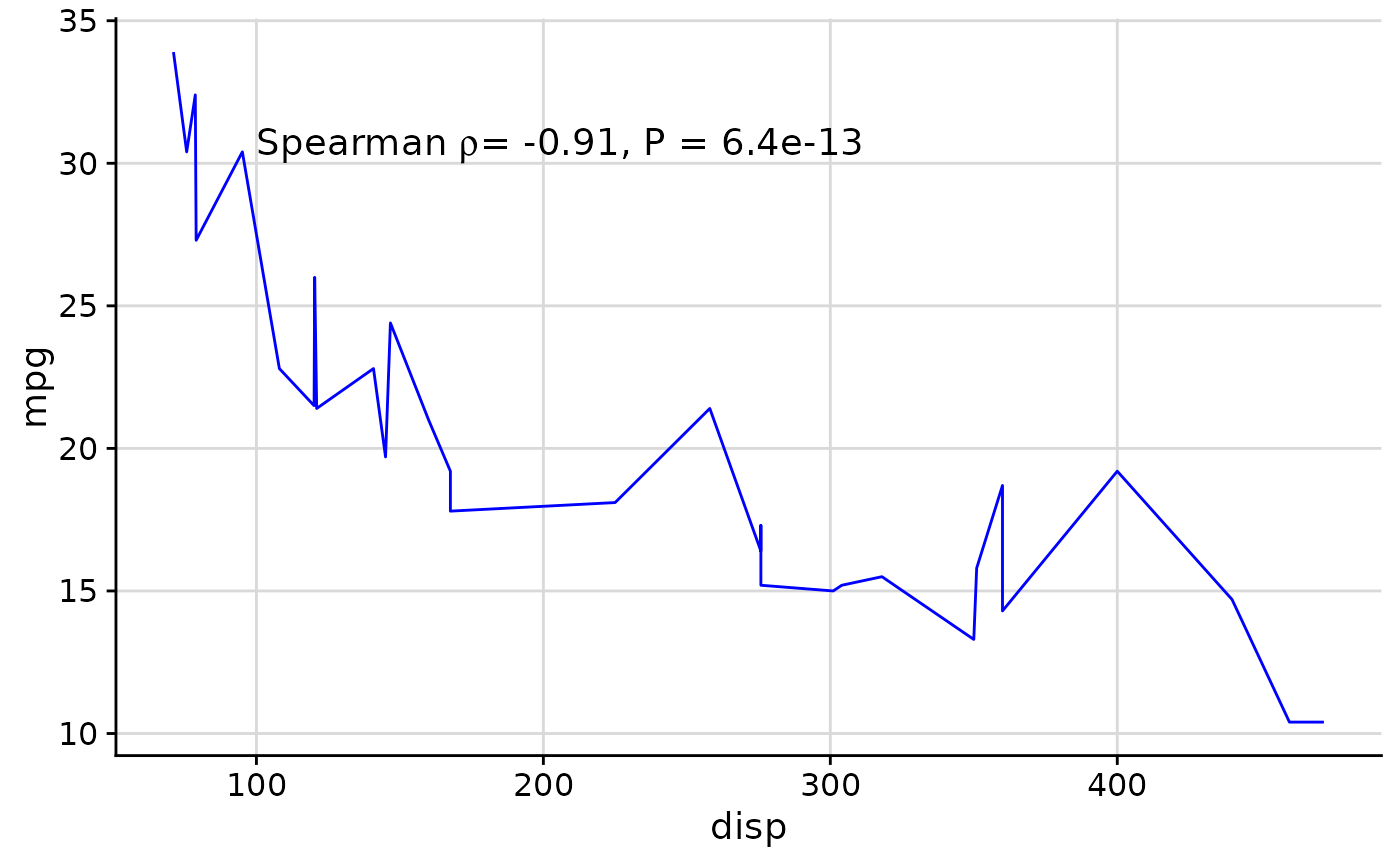 out <- cor.test(mtcars$disp, mtcars$mpg, method = 'sp', exact = FALSE)