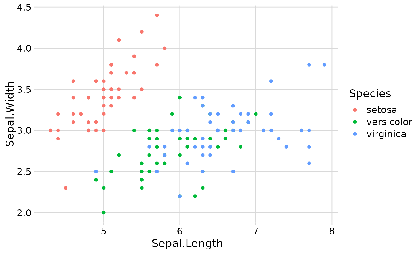 ggplot(iris, aes(x = Sepal.Length, y = Sepal.Width, color = Species)) +