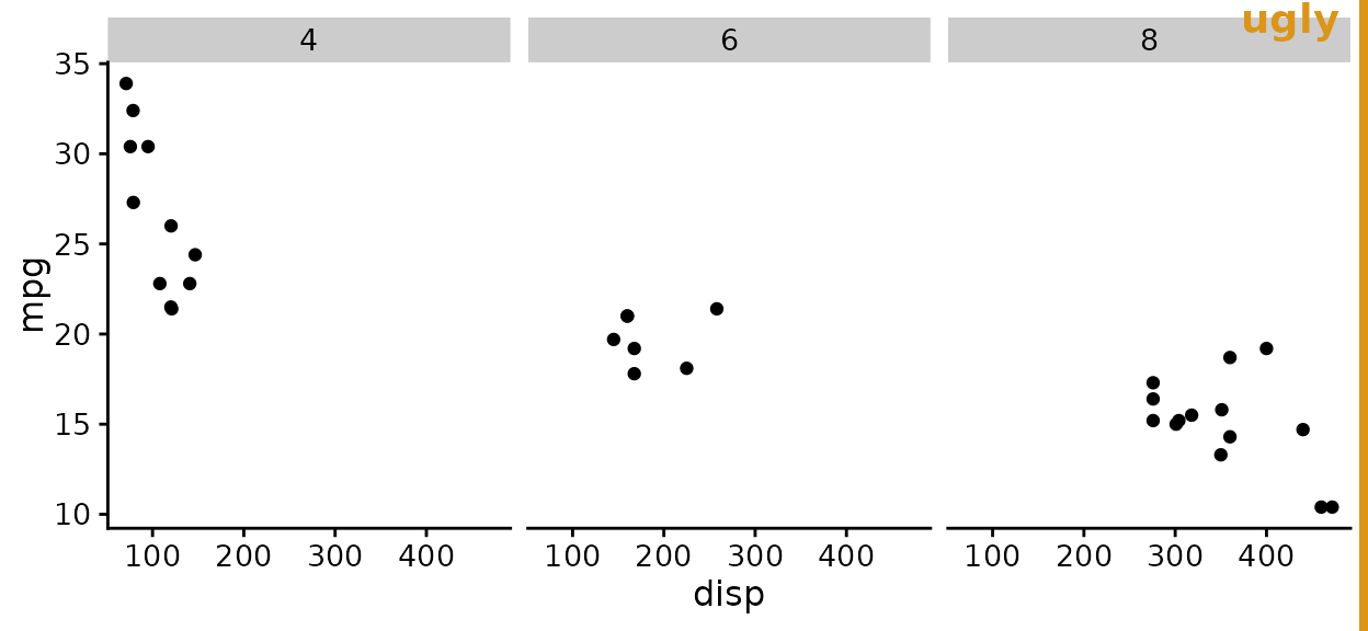 You need to pay special attention when faceting. A theme may look just fine for a single plot but work poorly in a faceted plot. As an example, consider what happens when we facet with theme_half_open().