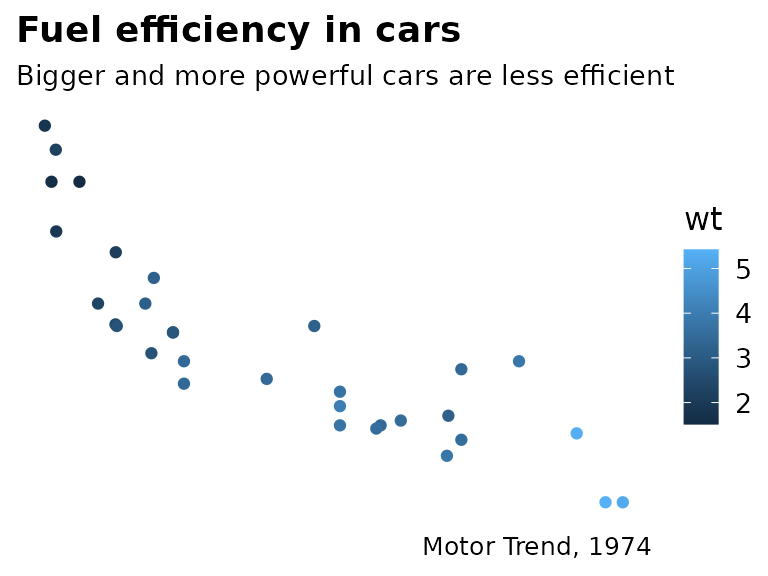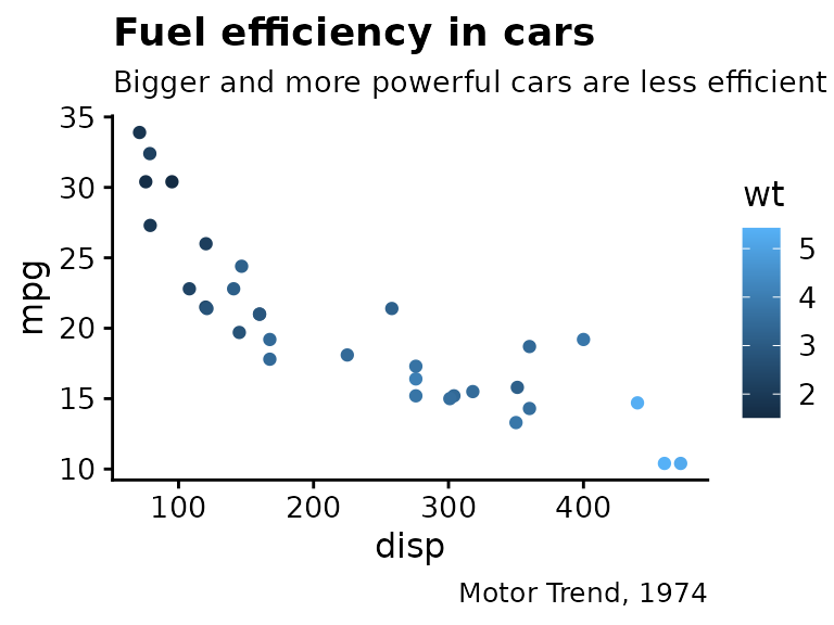 p <- ggplot(mtcars, aes(disp, mpg, color = wt)) +