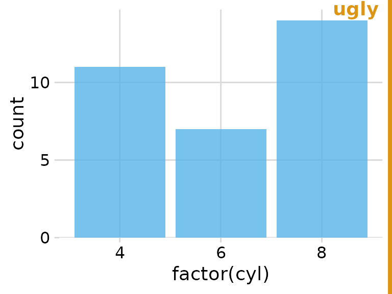 When choosing a plot theme, you should always pay attention to how it works for your specific plot. For example, if you are making a bar plot, theme_half_open() generates awkward floating bars because of ggplot2’s automatic axis expansion (i.e., the x axis line does not lie at y = 0). I consider such plots to be ugly.