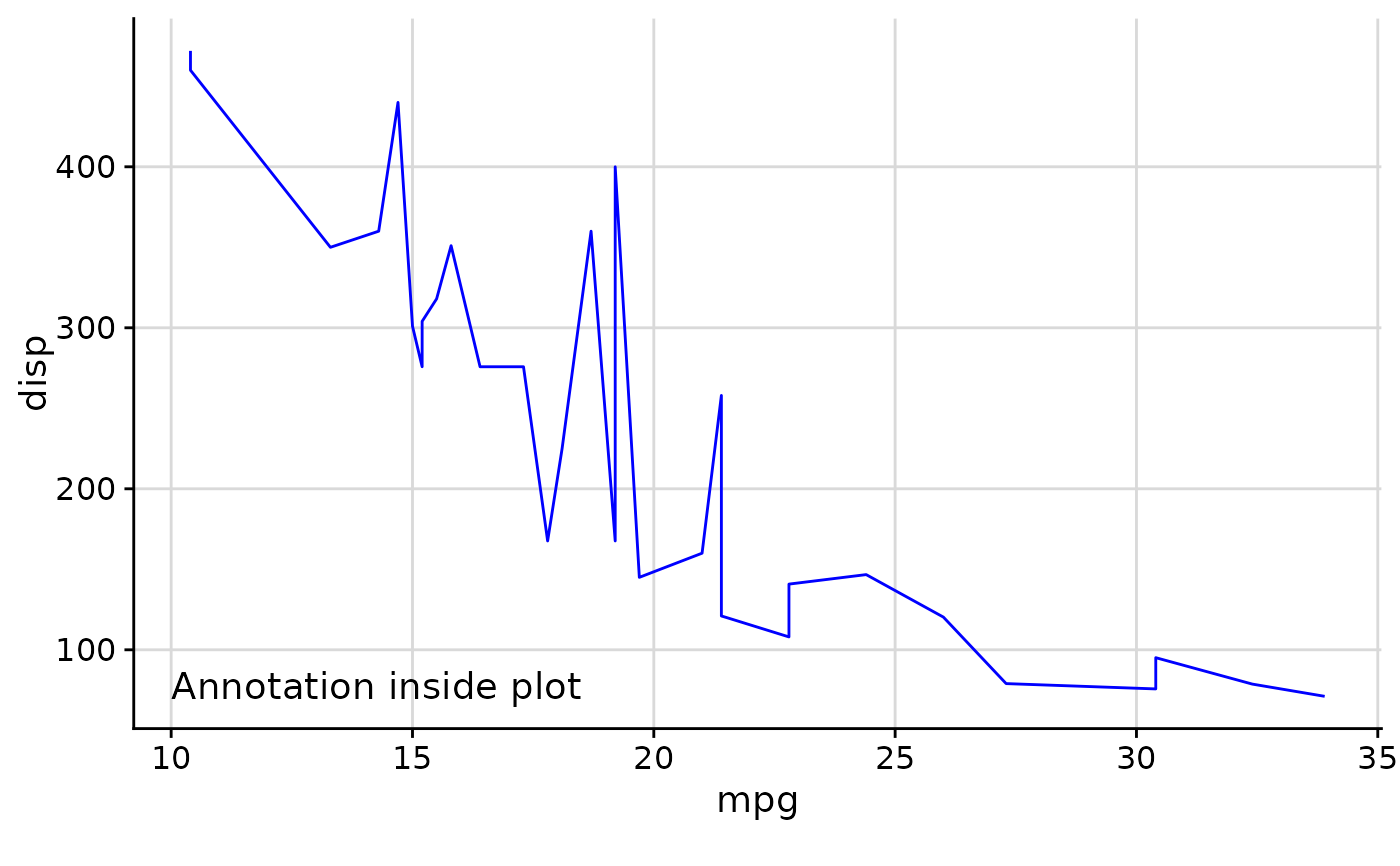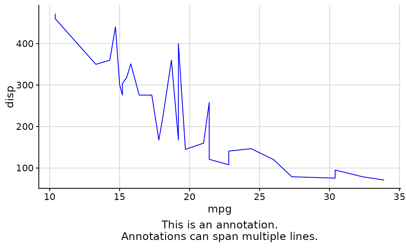 p1 <- ggplot(mtcars, aes(mpg, disp)) + geom_line(colour = "blue") + background_grid(minor='none')