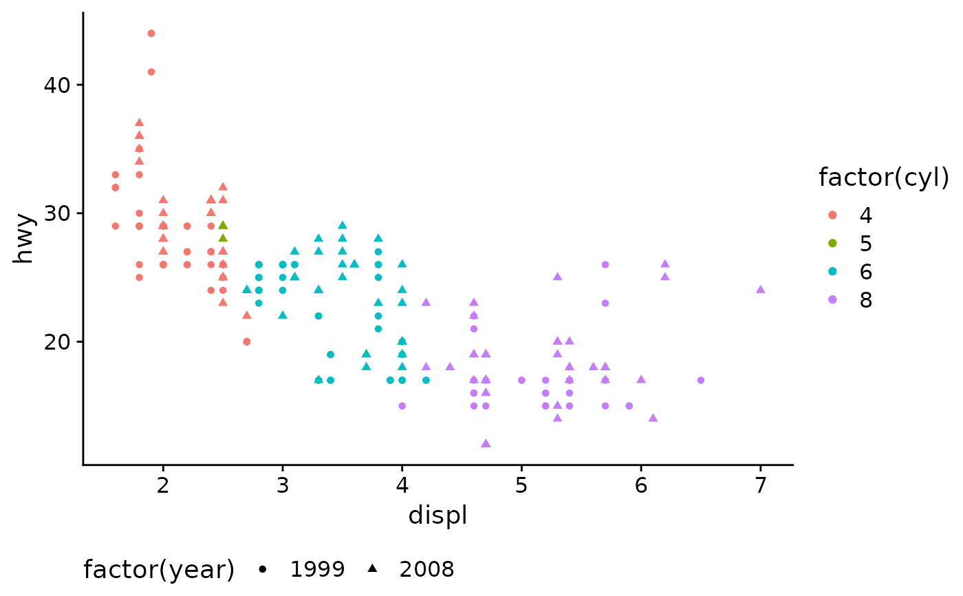 aes(displ, hwy, color = factor(cyl), shape = factor(year)) +