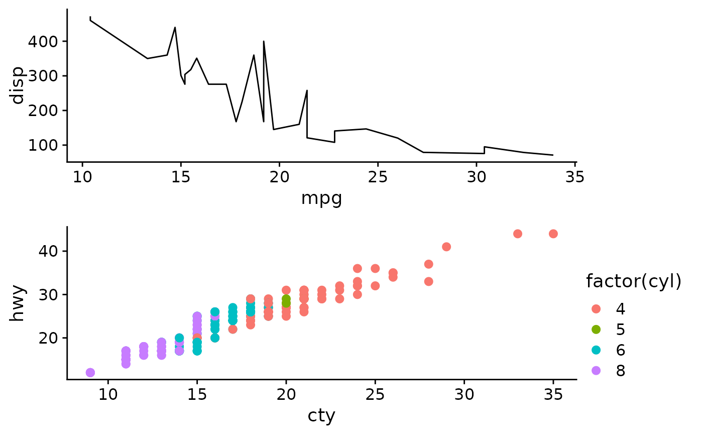 p1 <- ggplot(mtcars, aes(mpg, disp)) + geom_line()
