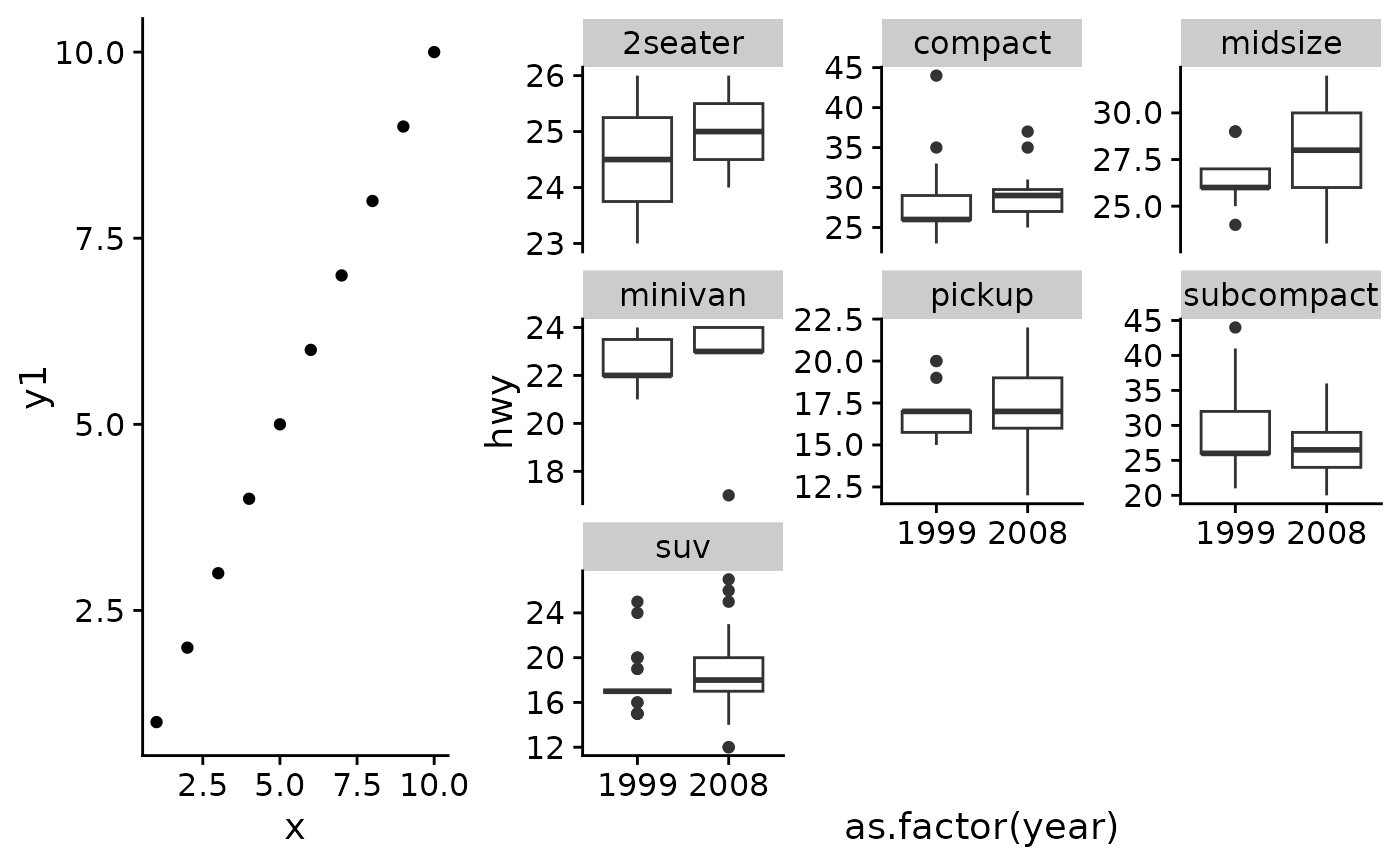 p5 <- ggplot(mpg, aes(as.factor(year), hwy)) +