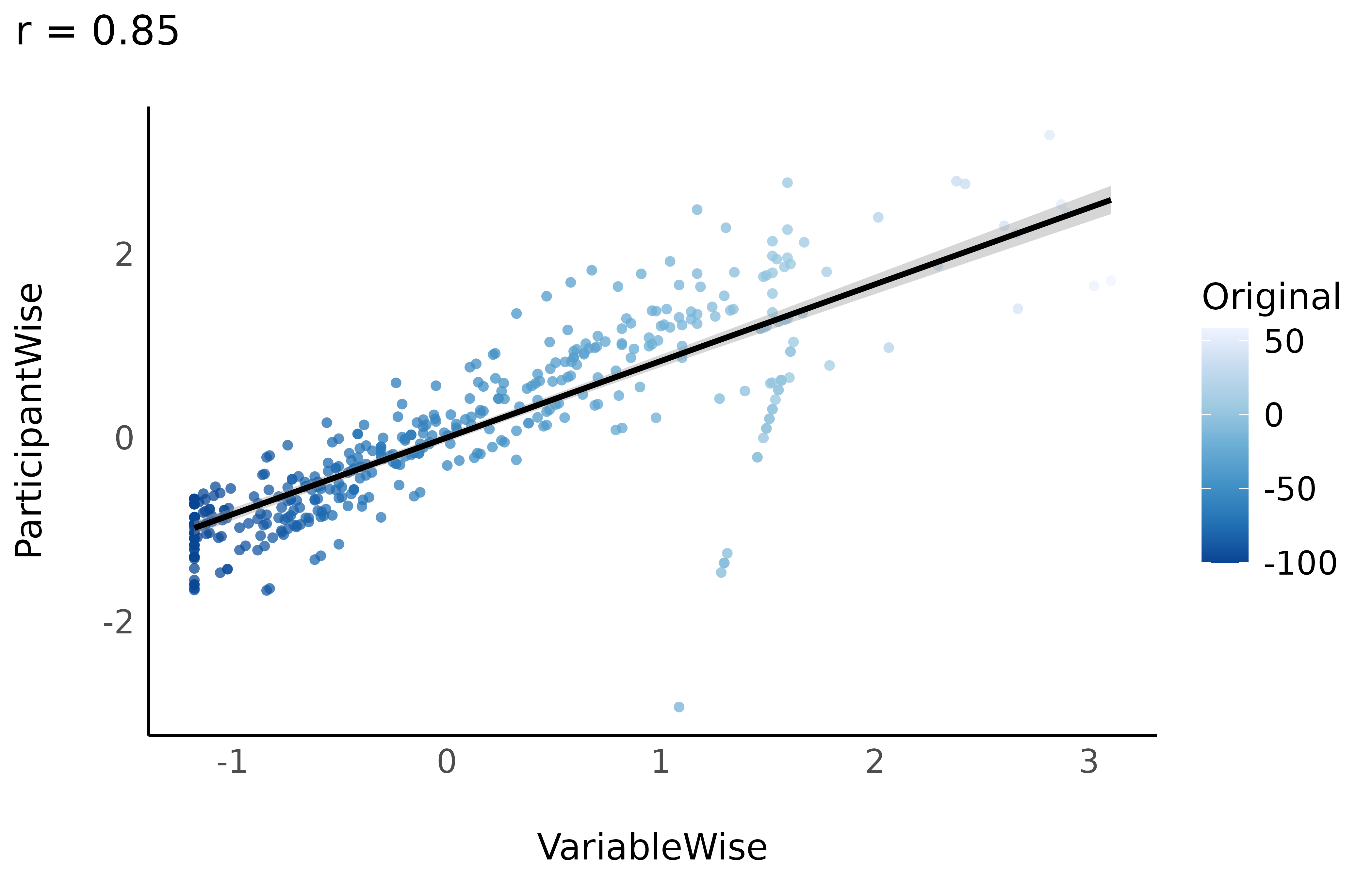 Let’s do a correlation between the variable-wise and participant-wise methods.