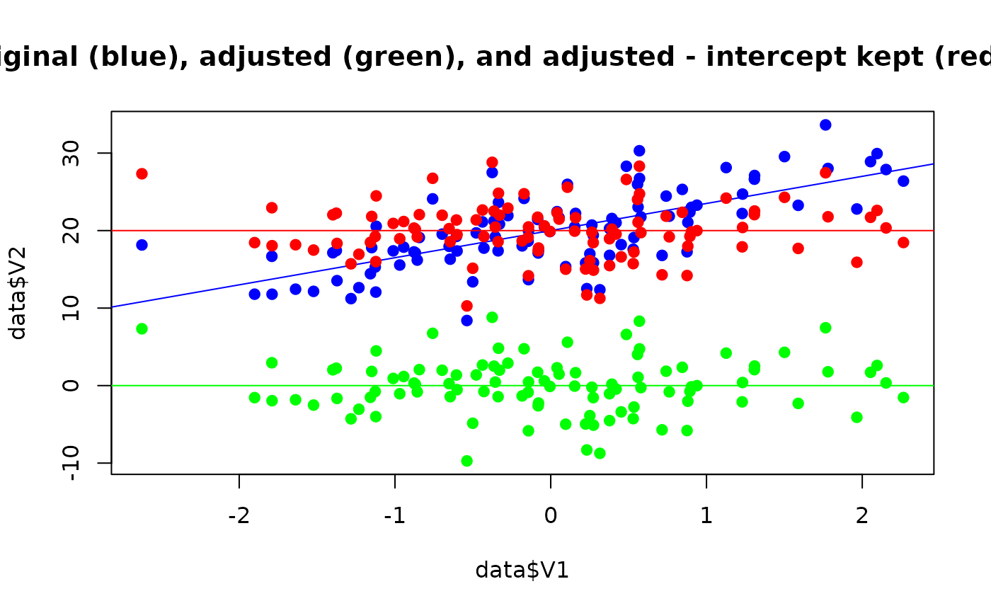 main = "Original (blue), adjusted (green), and adjusted - intercept kept (red) data"