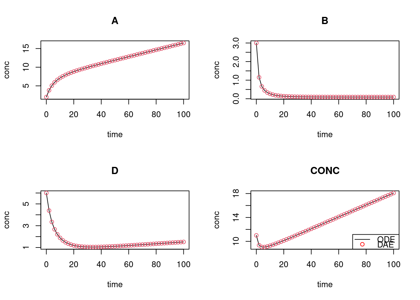 plot(ODE, DAE, xlab = "time", ylab = "conc", type = c("l", "p"),