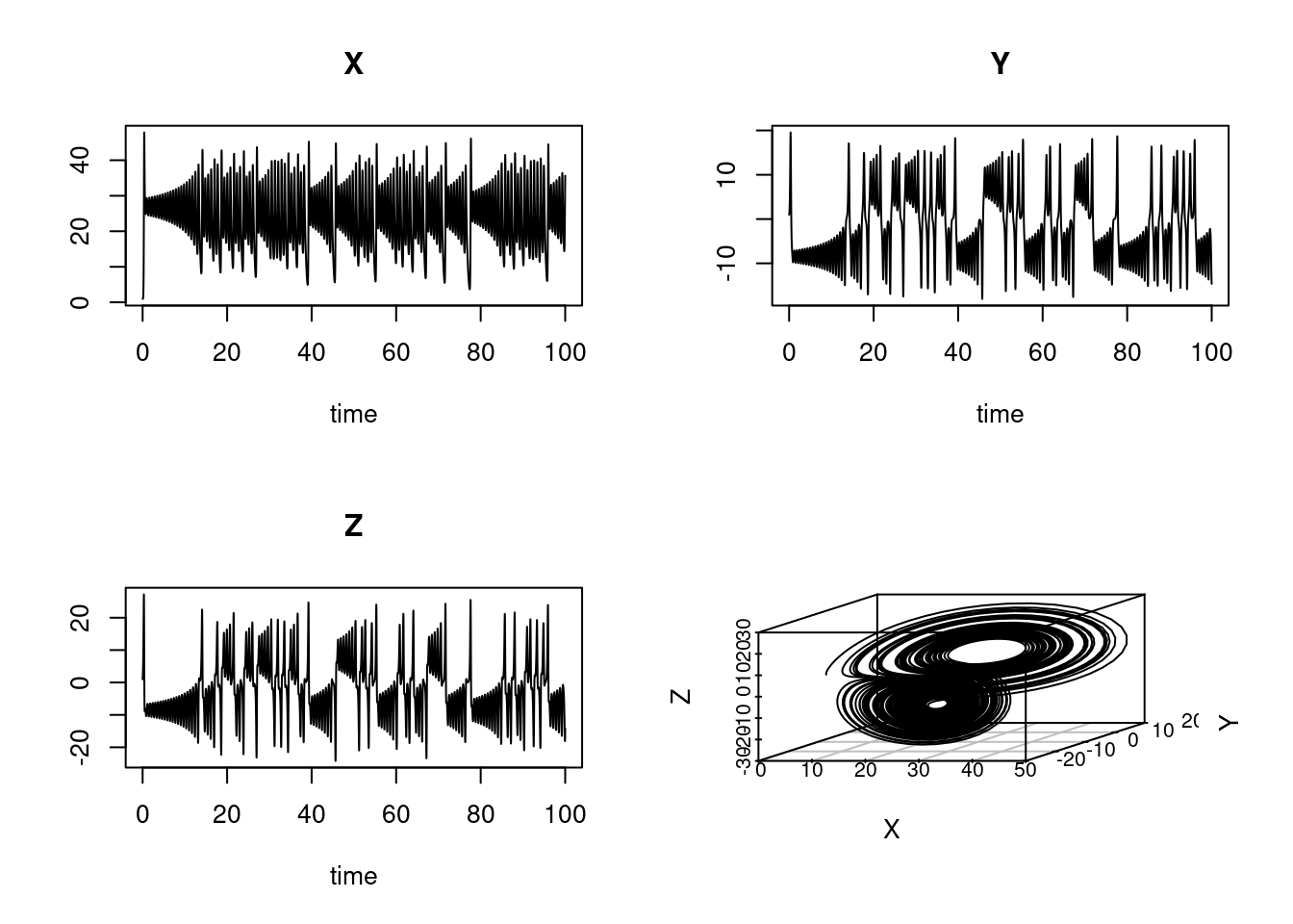 out <- ode(y = state, times = times, func = Lorenz, parms = parameters)