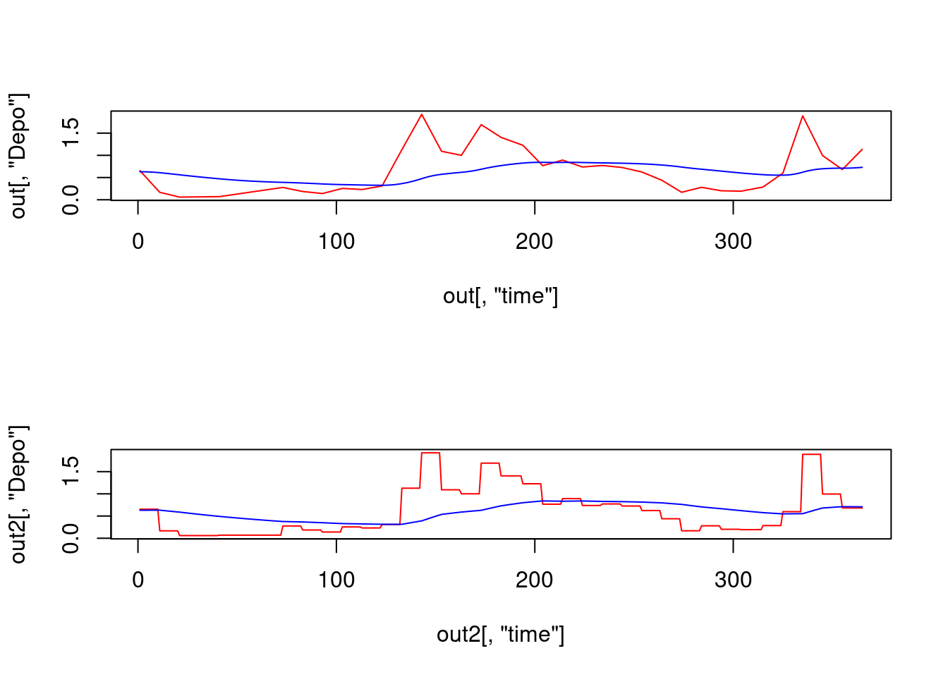 lines(Out2[,"time"], Out2[,"depo"], col = "red", lwd = 2)