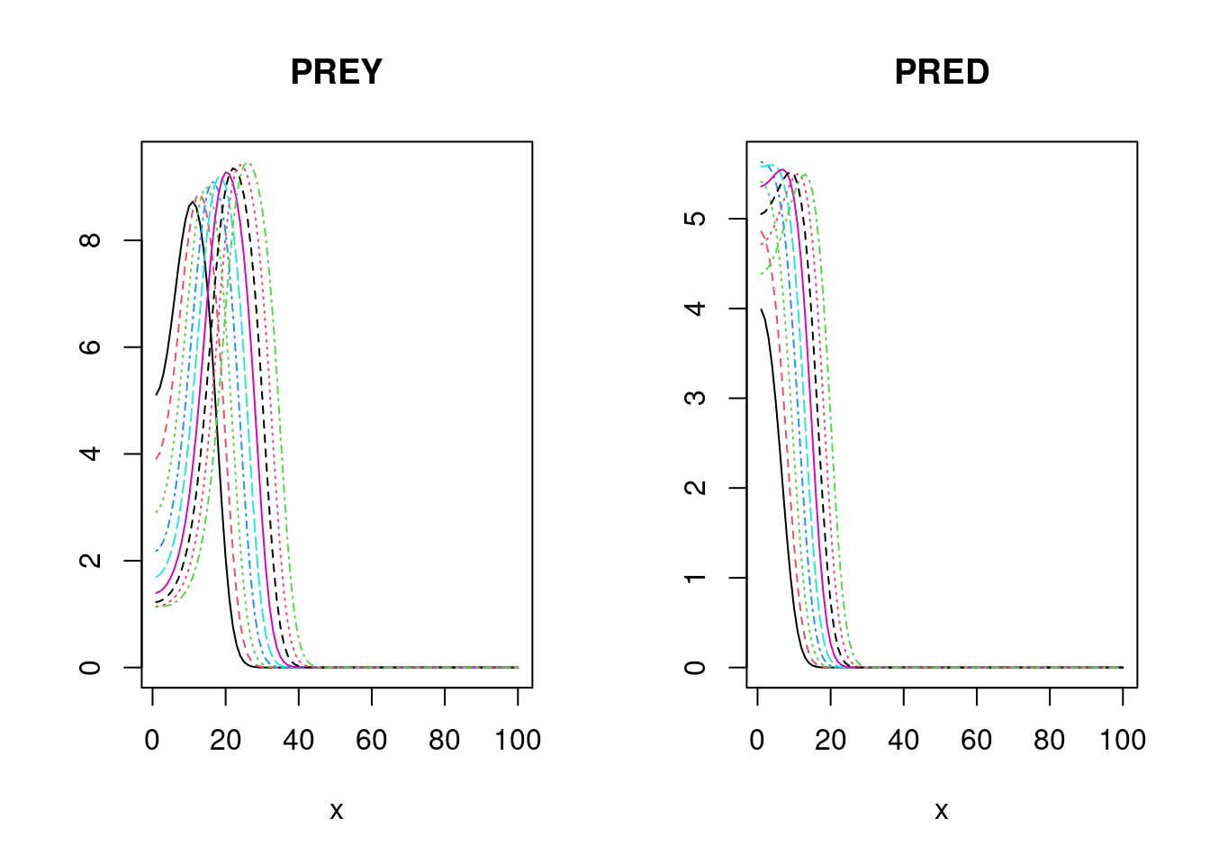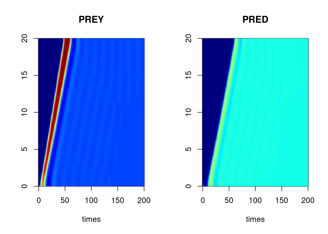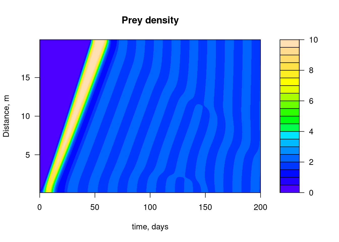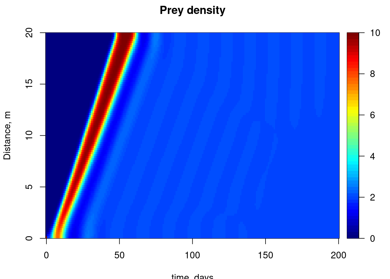 image(out, which = "PREY", grid = r, xlab = "time, days",