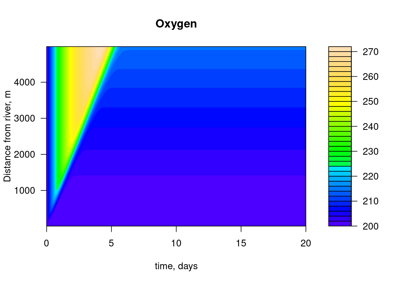 image(out, grid = x, xlab = "time, days", ylab = "Distance from river, m")
