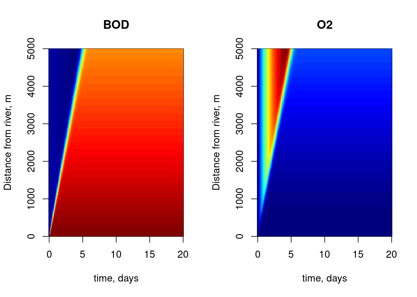 FluxBOD <- v * c(BOD_0, BOD) # fluxes due to water transport
