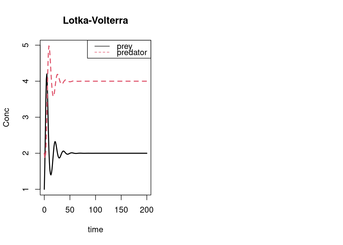 legend("topright", c("prey", "predator"), col = 1:2, lty = 1:2)