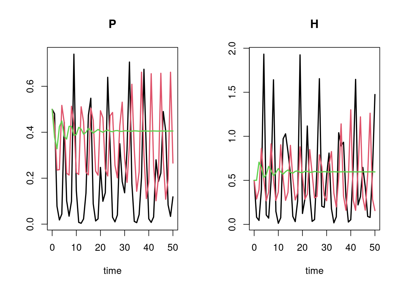out3<- ode(func = Parasite, y = c(P = 0.5, H = 0.5), times = 0:50, parms = 35,
