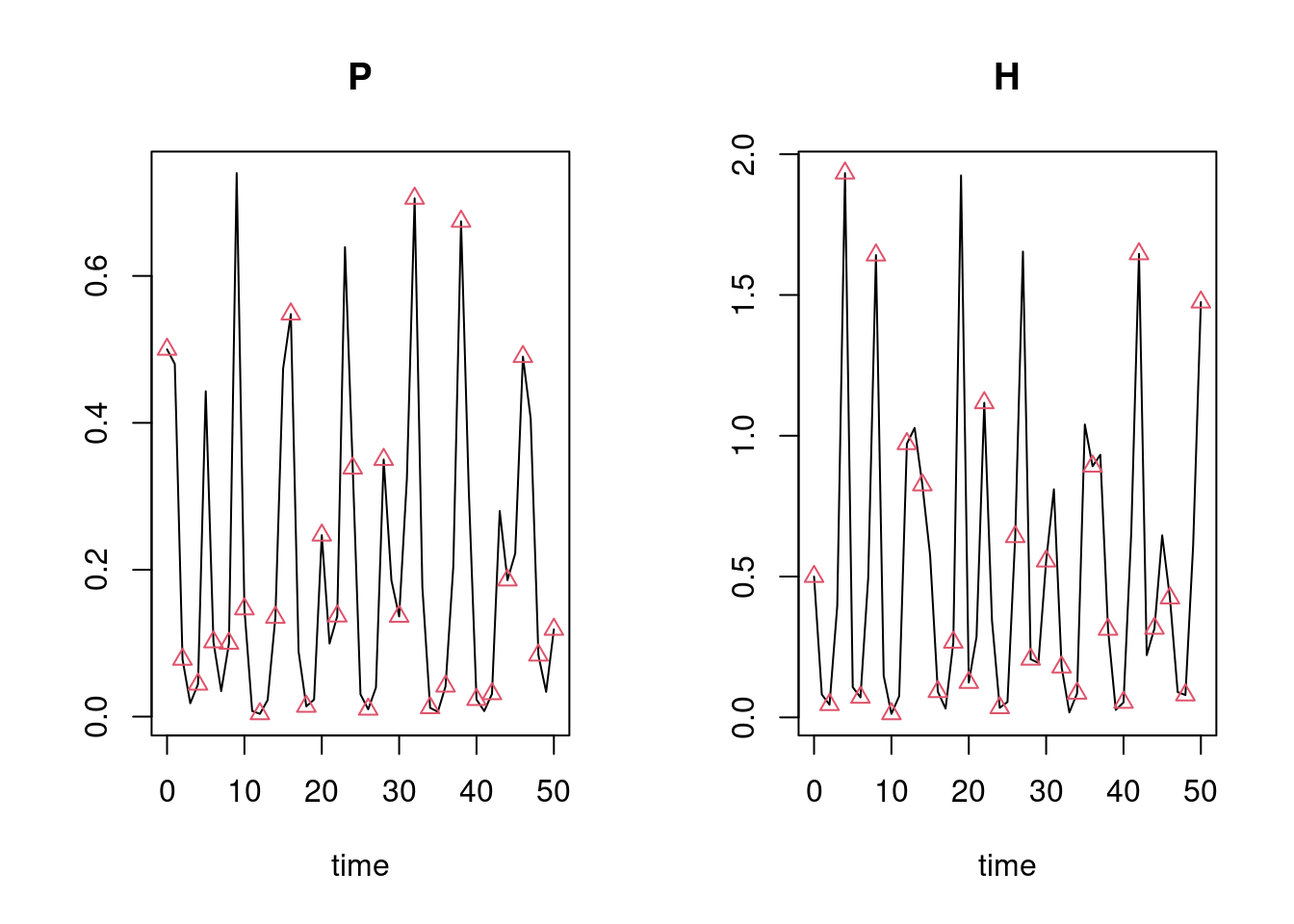 out2<- ode(func = Parasite, y = c(P = 0.5, H = 0.5), times = 0:50, parms = 25,