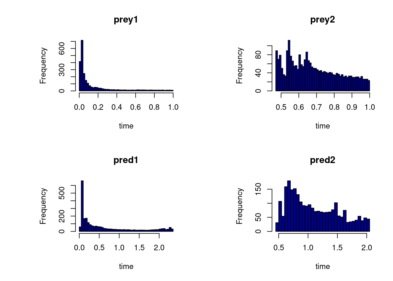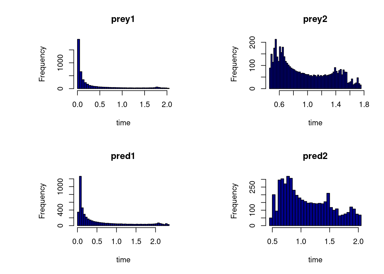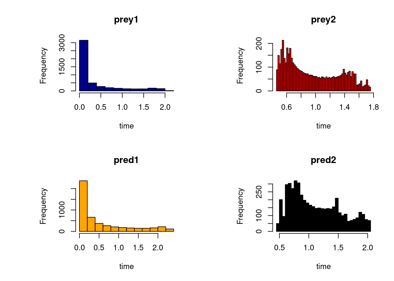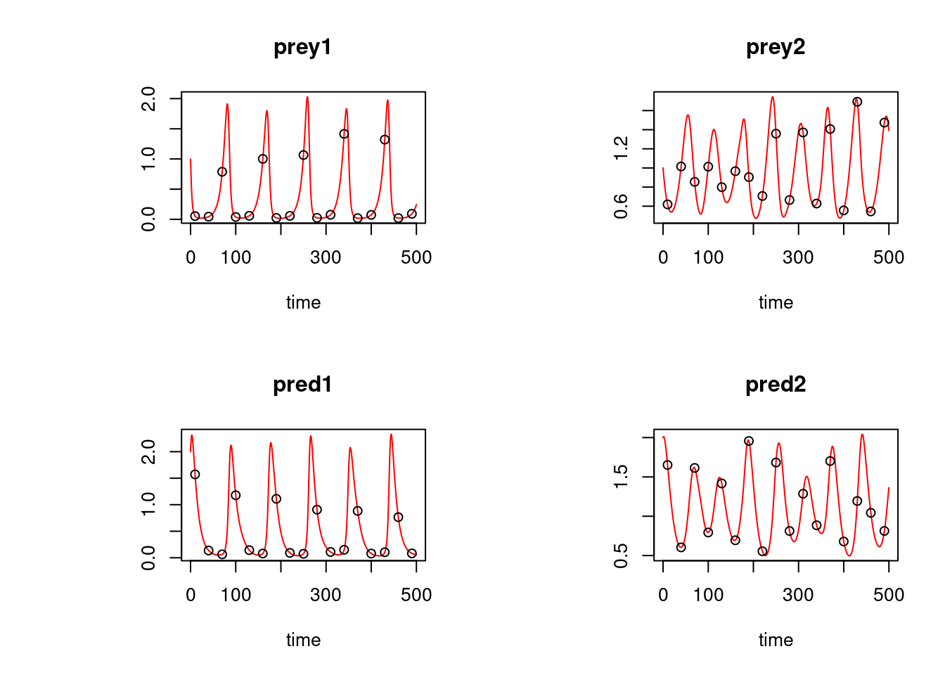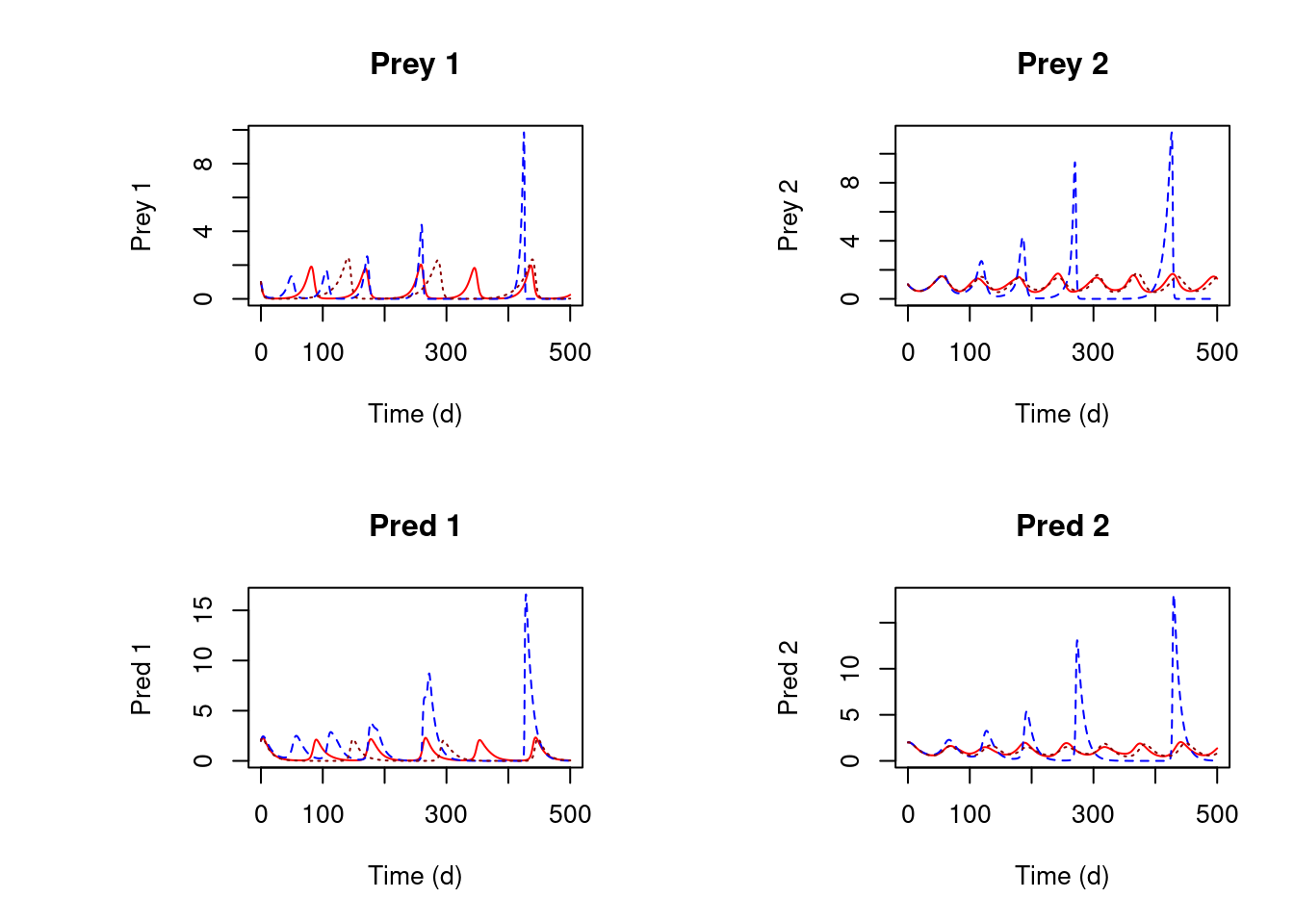 xlab = "Time (d)", main = c("Prey 1", "Prey 2", "Pred 1", "Pred 2"),