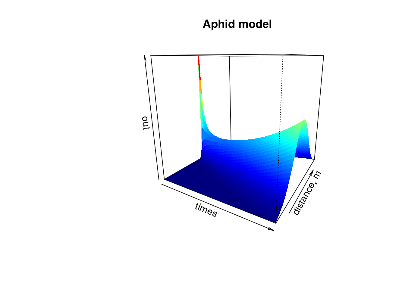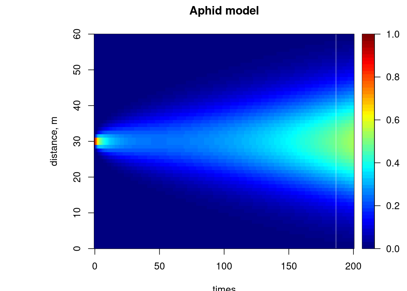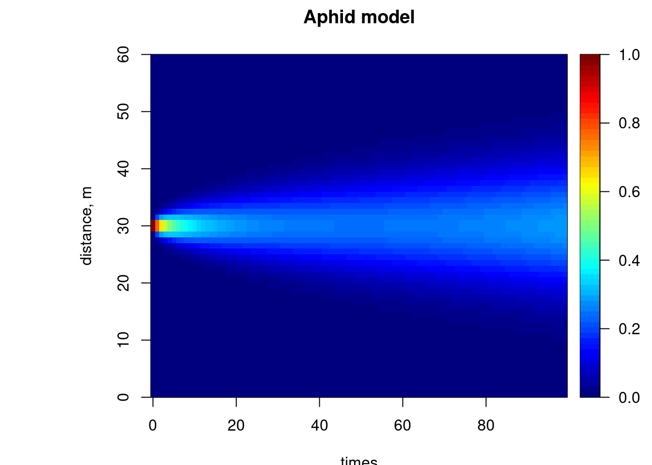 image(out, grid = Distance, main = "Aphid model", ylab = "distance, m",
