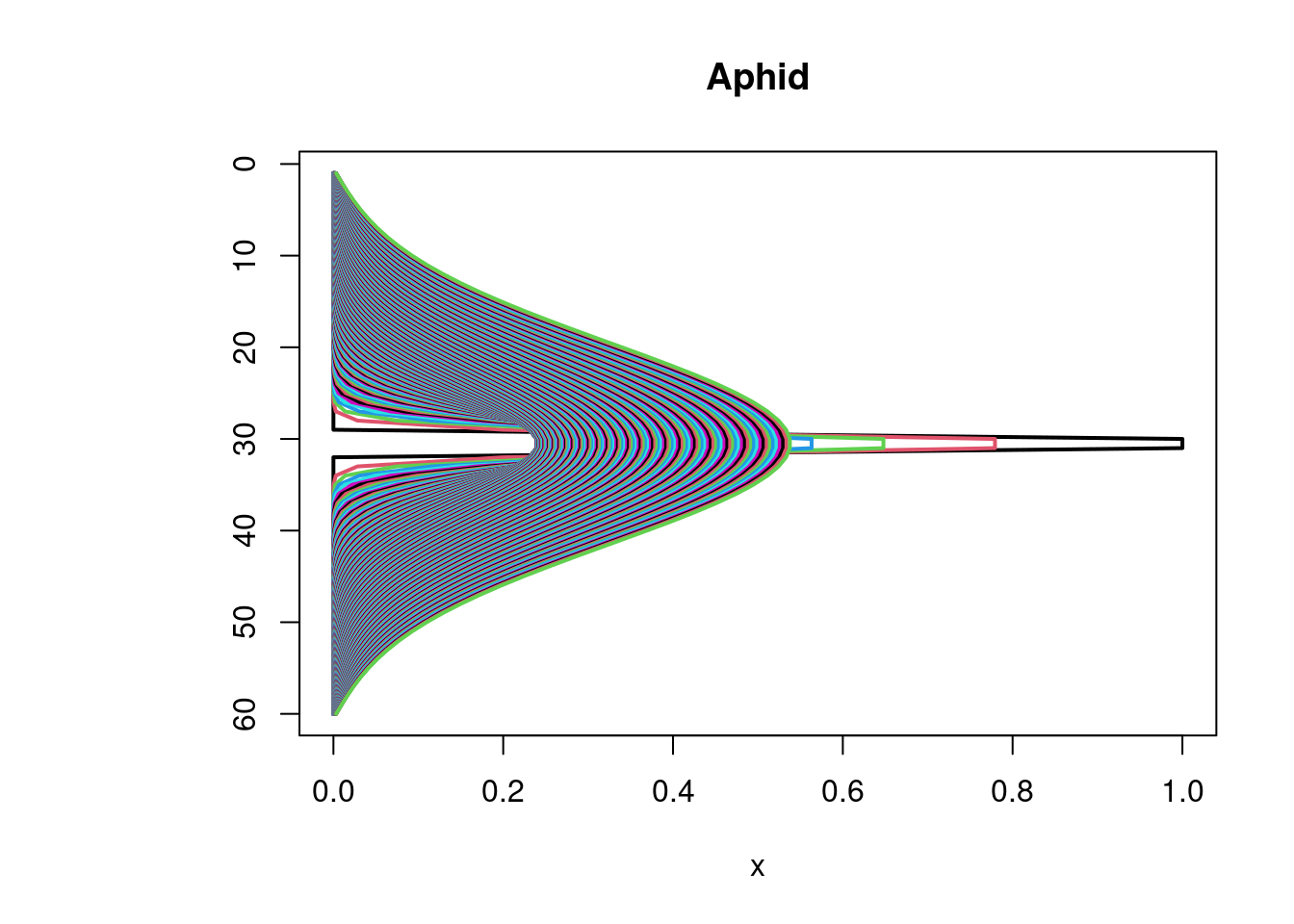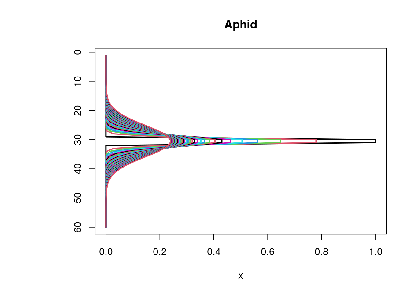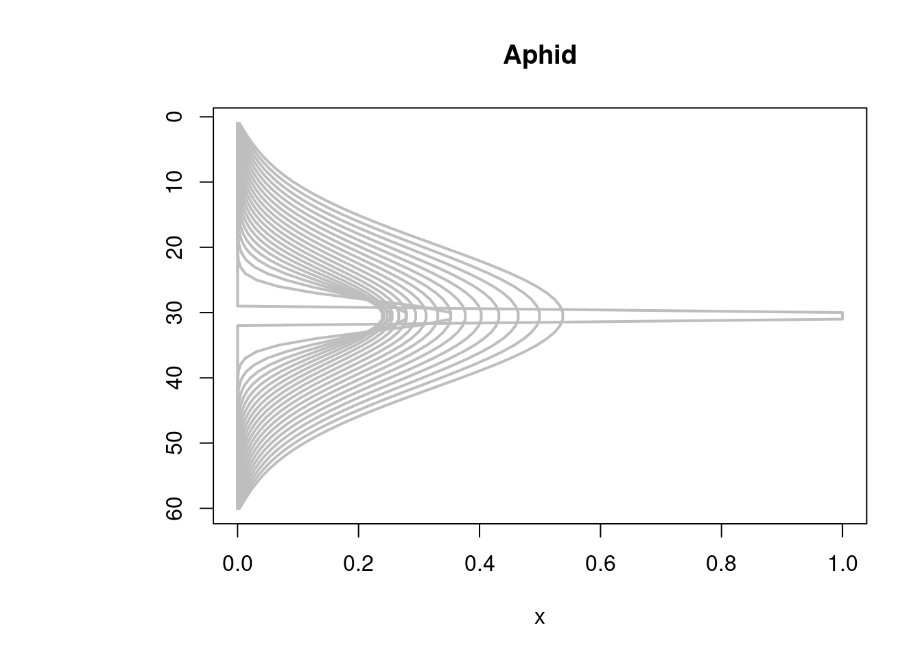 image(out, grid = Distance, main = "Aphid model", ylab = "distance, m",