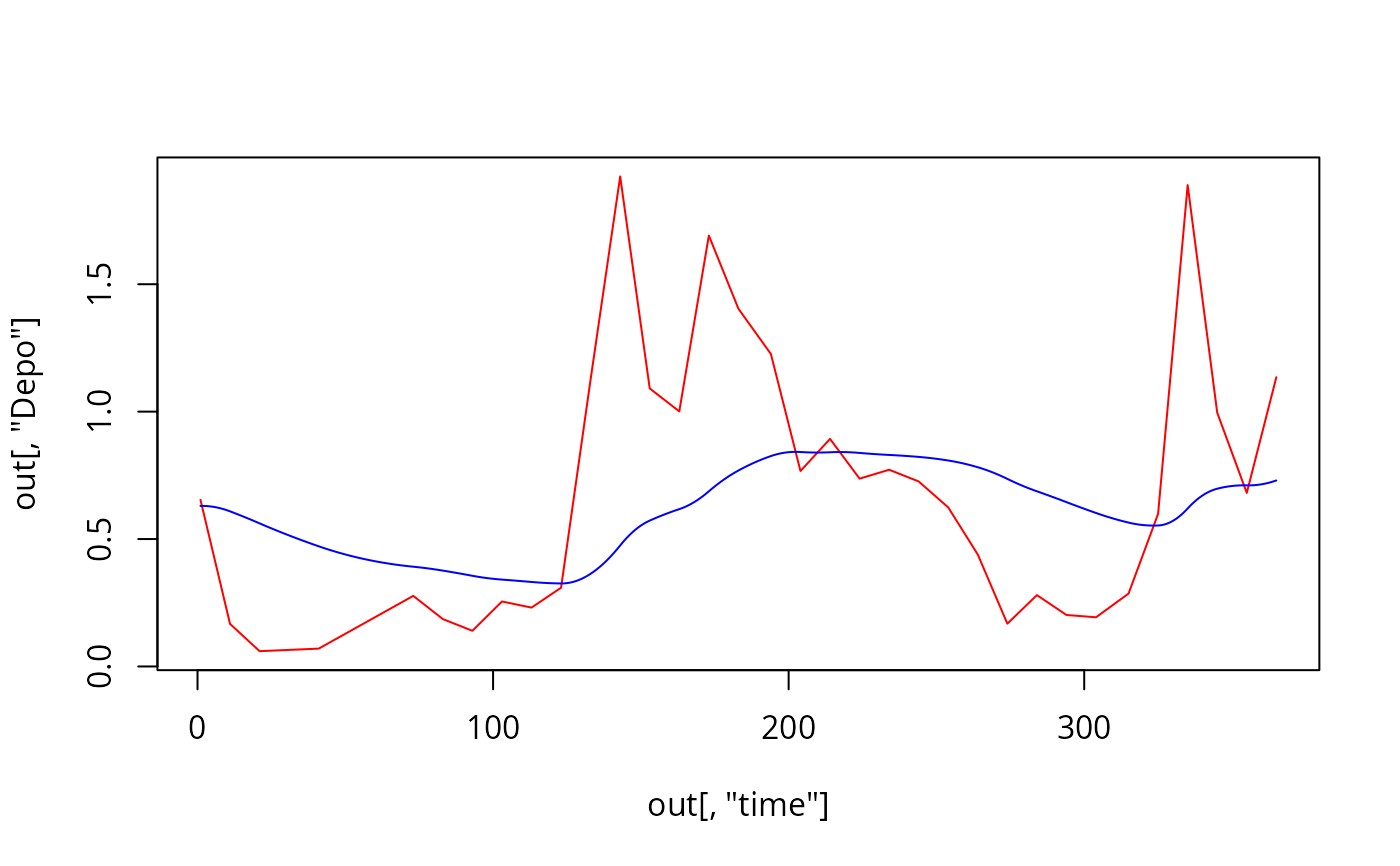 plot(out2[,"time"], out2[,"Depo"], type = "l",col = "red")