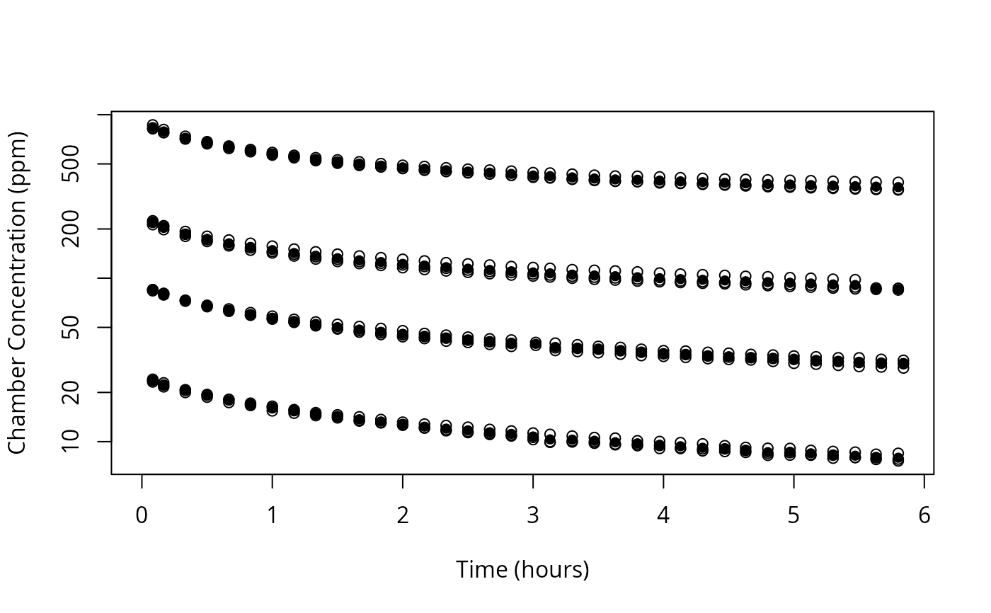 ccl4data.RdThe results of a closed chamber experiment to determine metabolic parameters for CCl4 (carbon tetrachloride) in rats.
