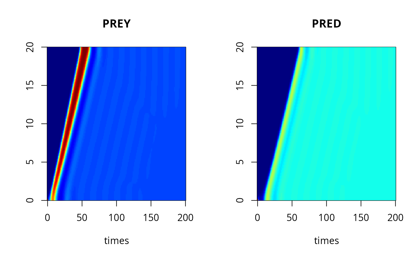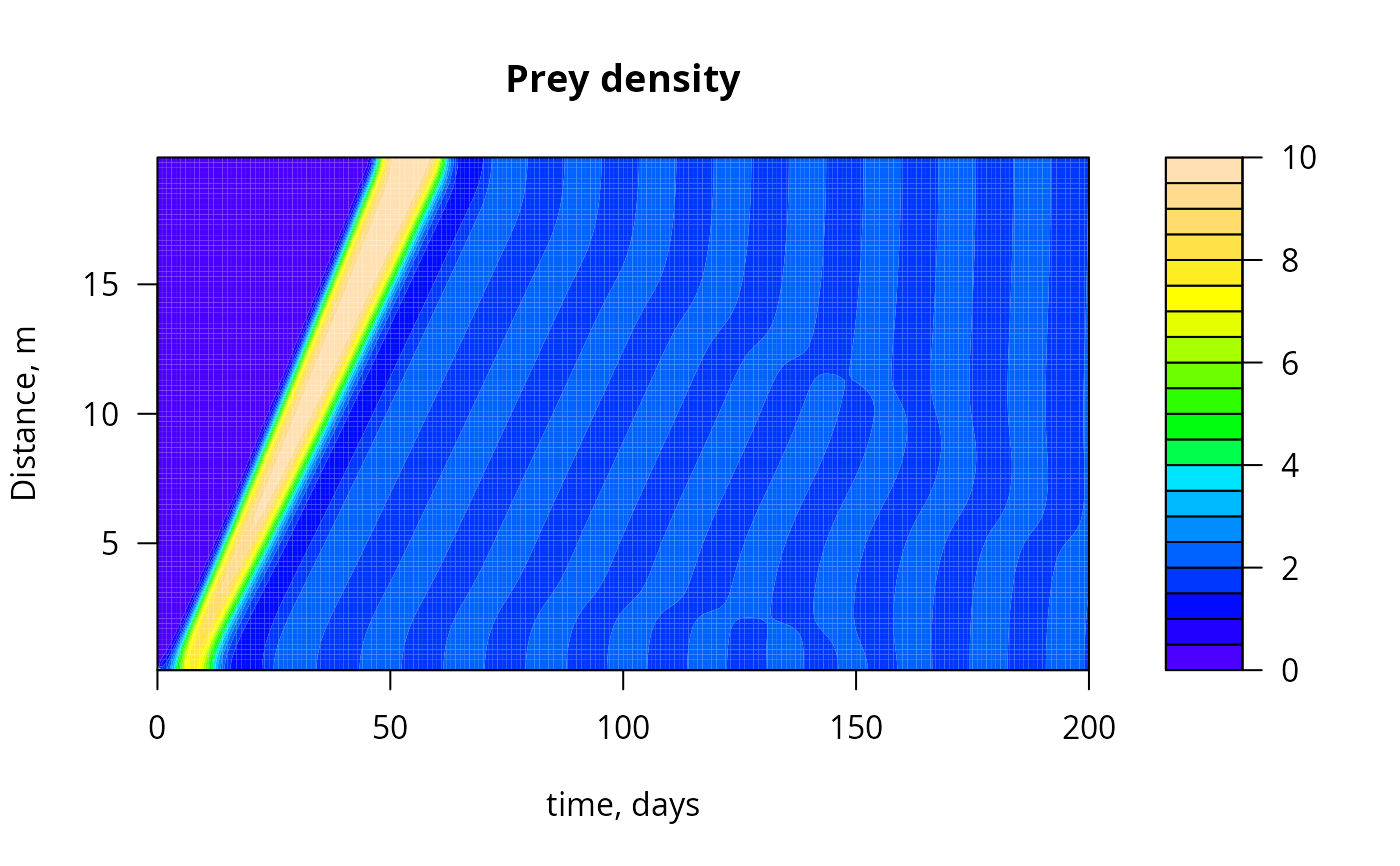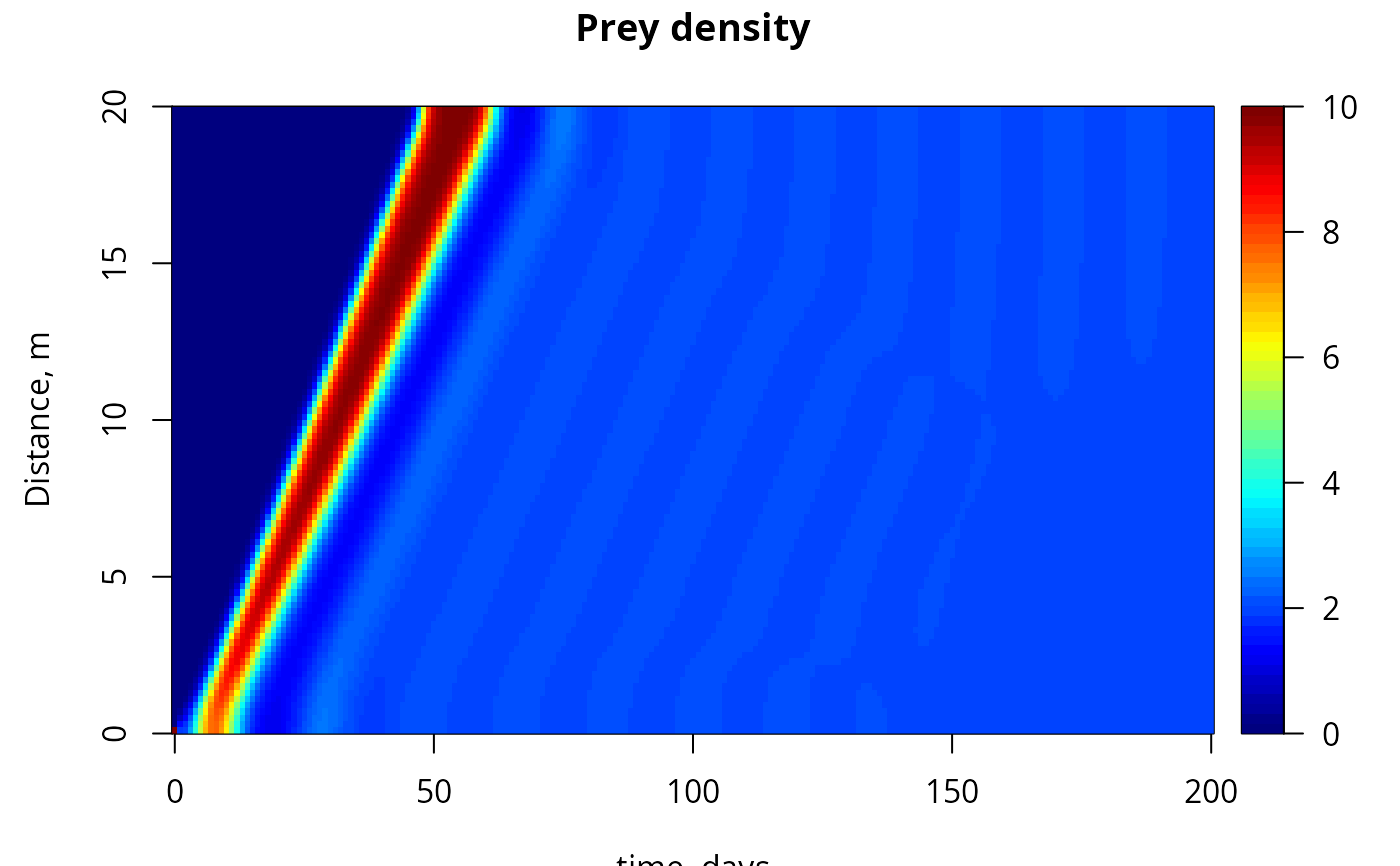 image(out, which = "PREY", grid = r, xlab = "time, days",