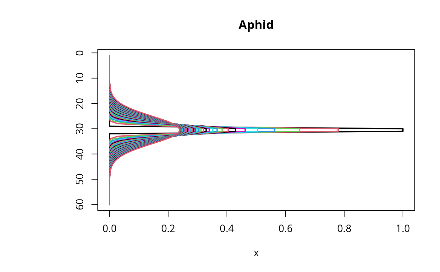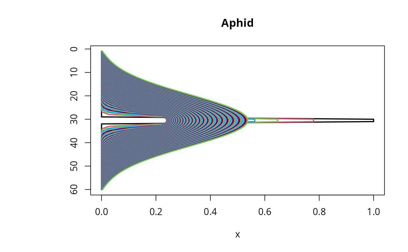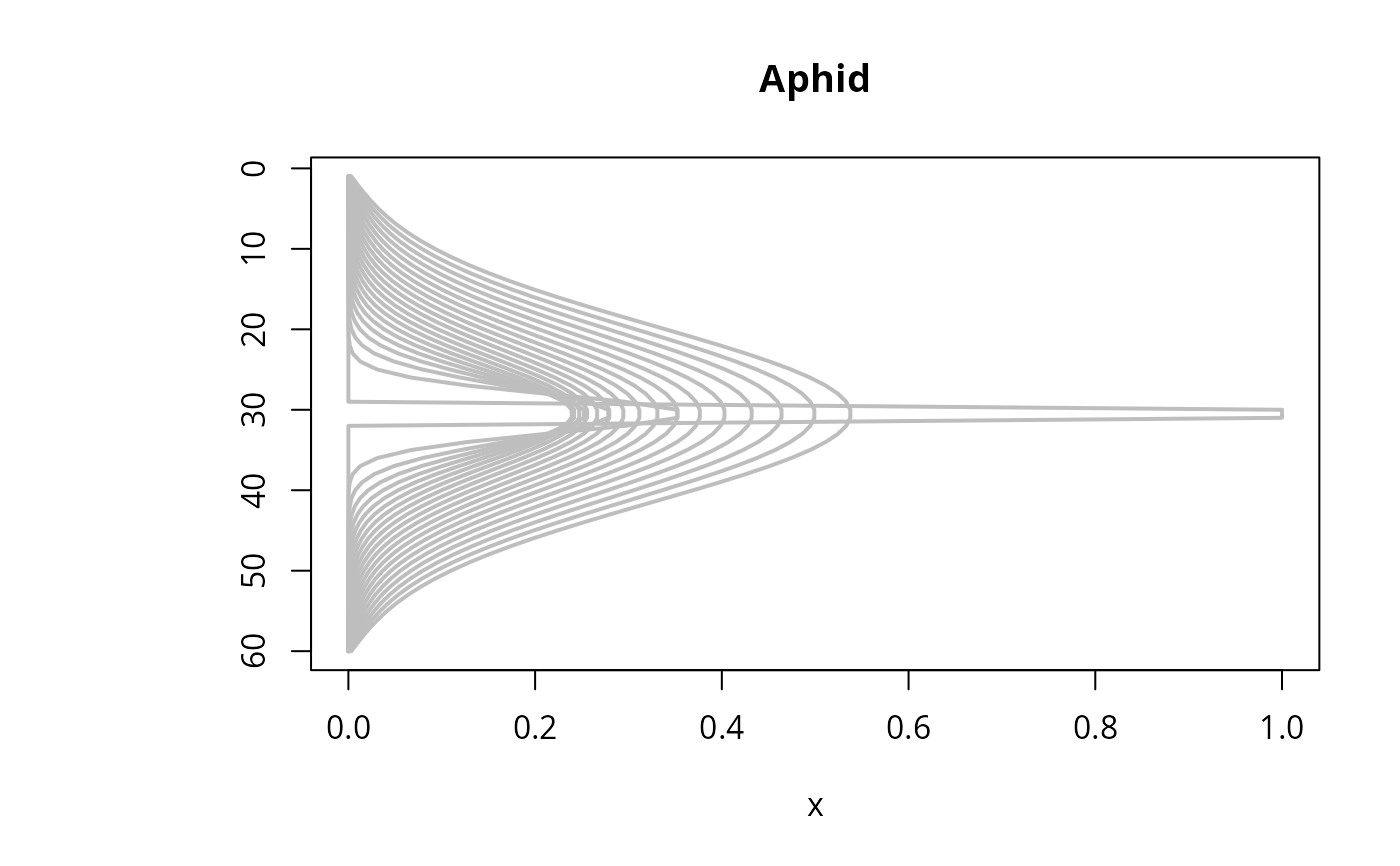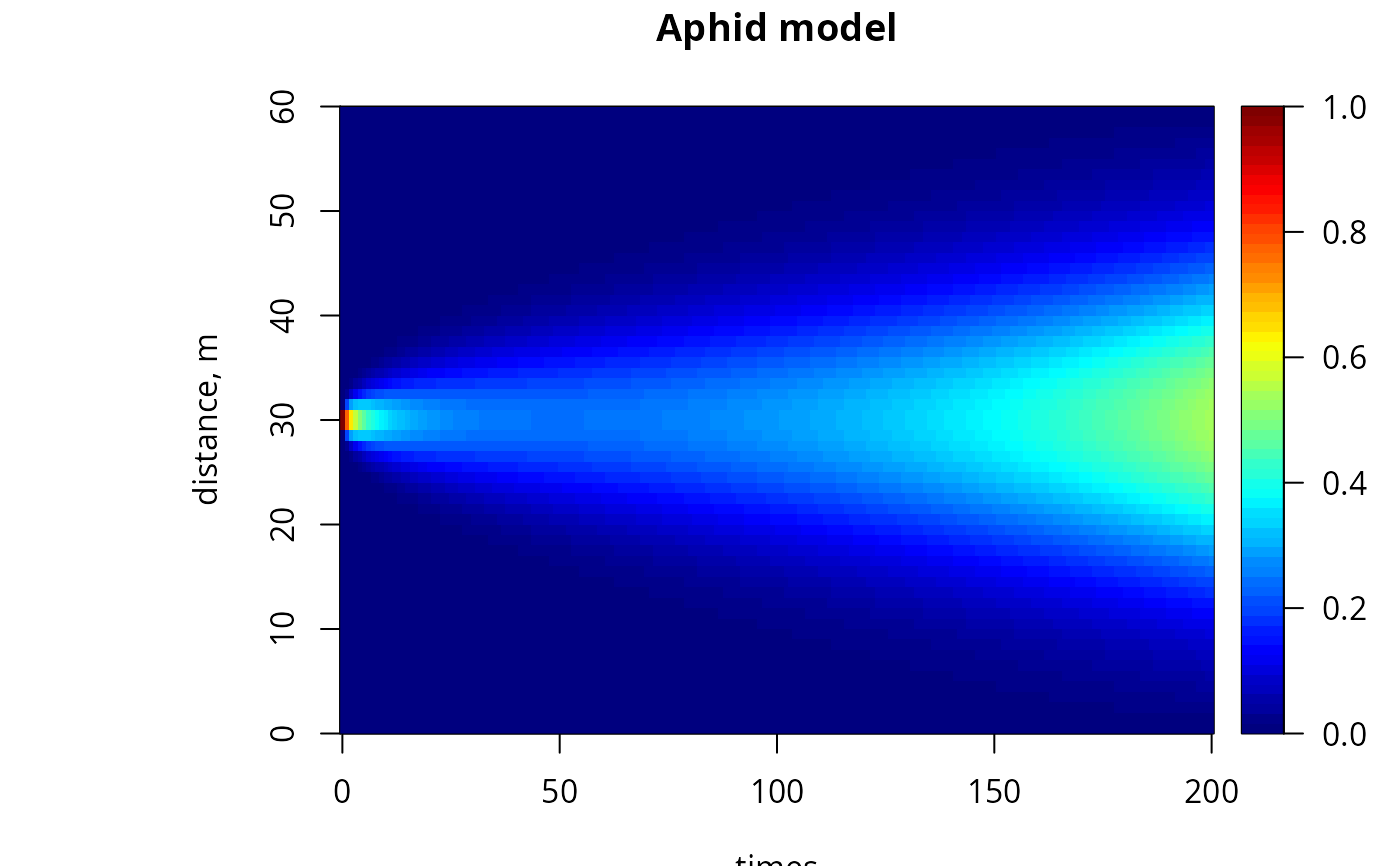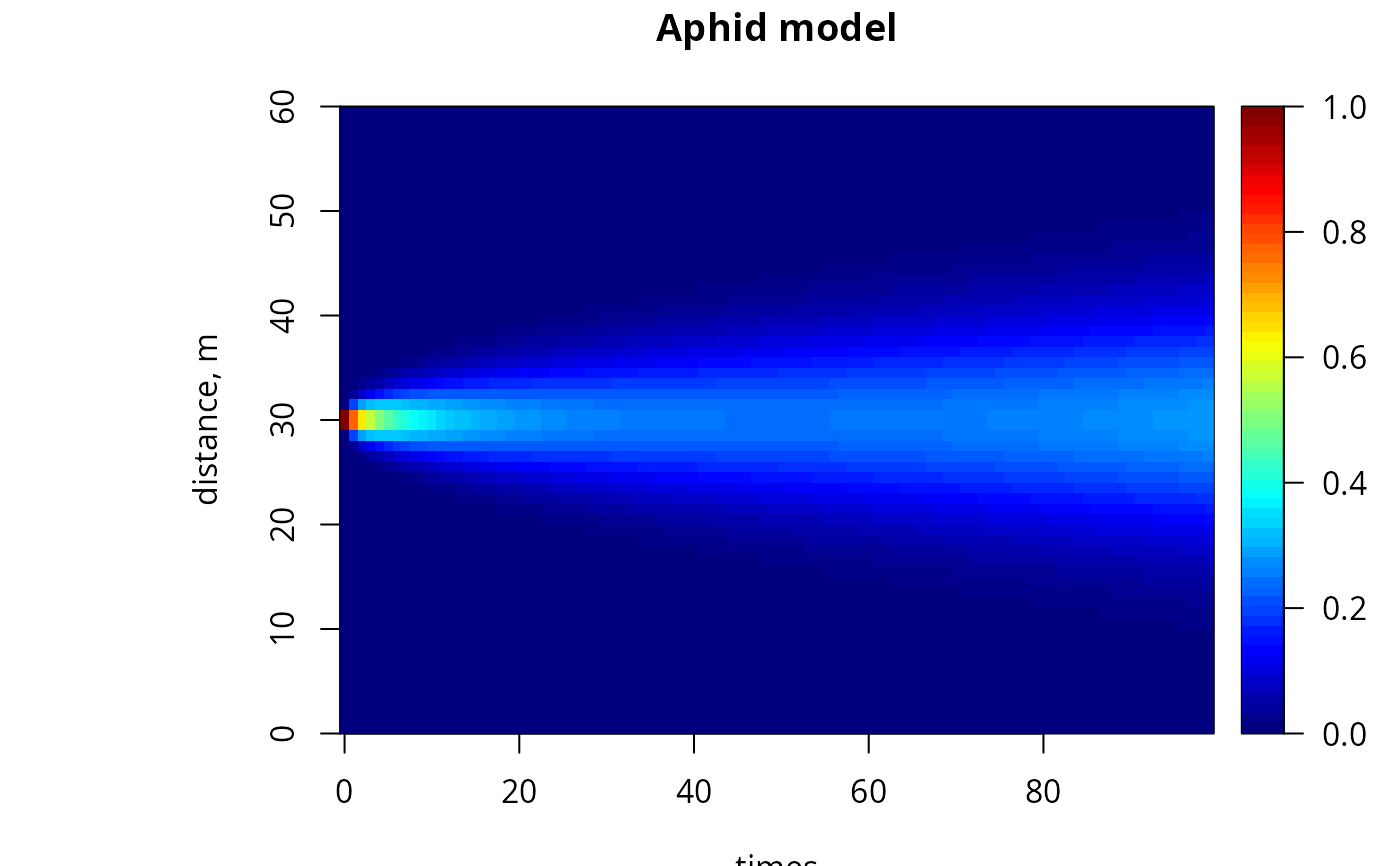 image(out, grid = Distance, main = "Aphid model", ylab = "distance, m",