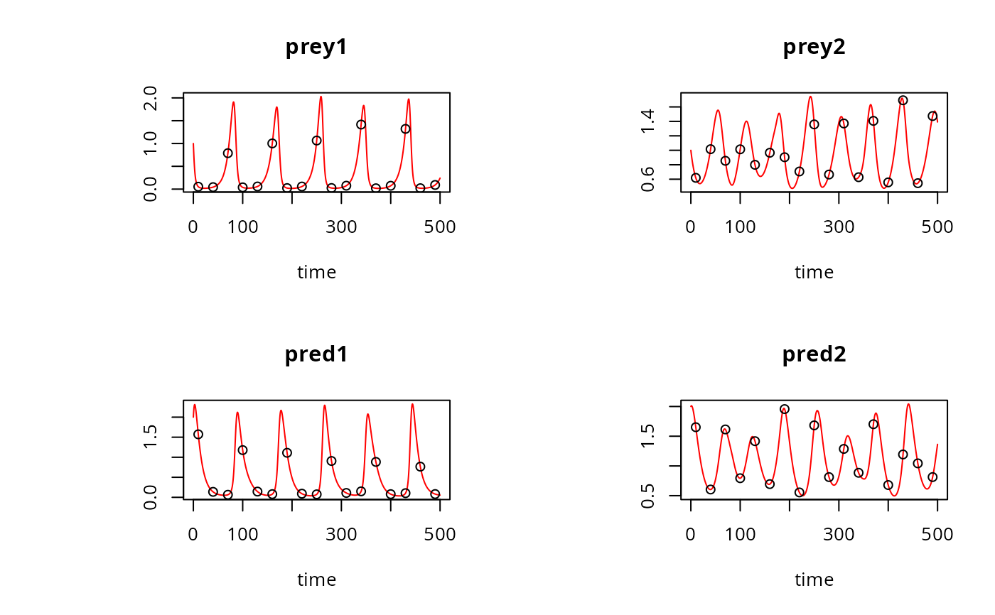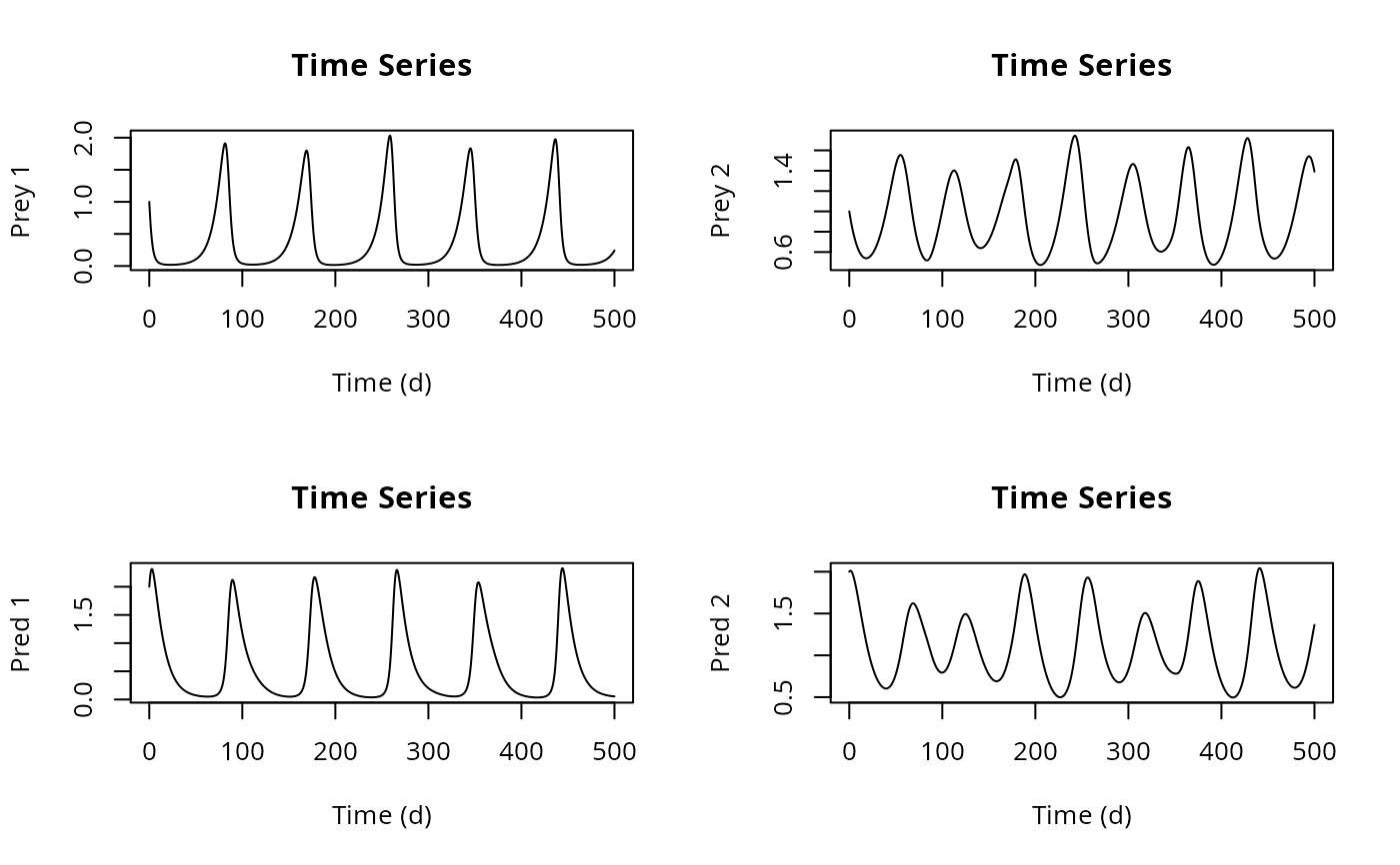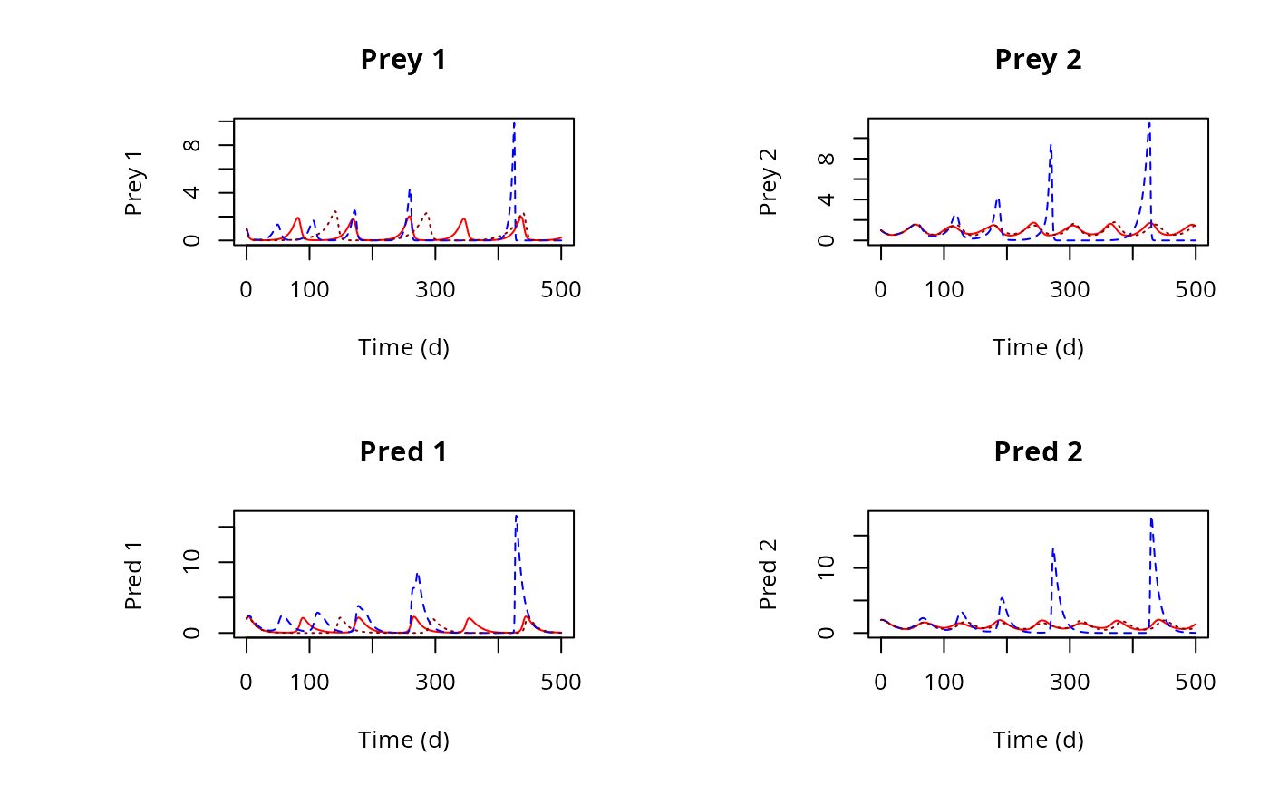 xlab = "Time (d)", main = c("Prey 1", "Prey 2", "Pred 1", "Pred 2"),