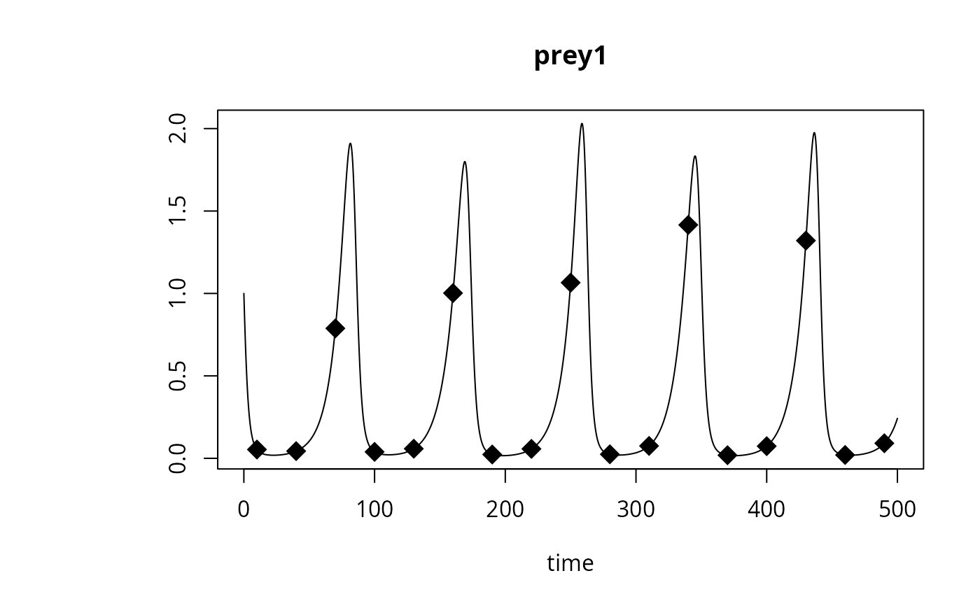 plot(out, which = "prey1", type = "l", obs = obs,