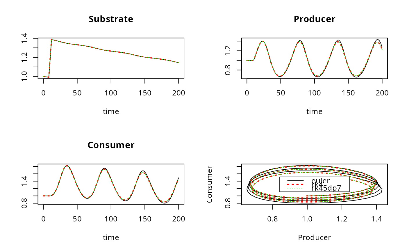 rkMethodfor a list of available Runge-Kutta parameter sets,rk4andeulerfor special versions without interpolation (and less overhead),lsoda,lsode,lsodes,lsodar,vode,daspkfor solvers of the Livermore family,odefor a general interface to most of the ODE solvers,ode.bandfor solving models with a banded Jacobian,ode.1Dfor integrating 1-D models,ode.2Dfor integrating 2-D models,ode.3Dfor integrating 3-D models,diagnosticsto print diagnostic messages.