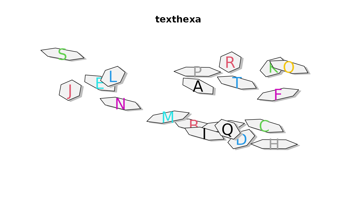 texthexa.Rdadds one or more lines of text, centered around "mid" in an hexagonal box.