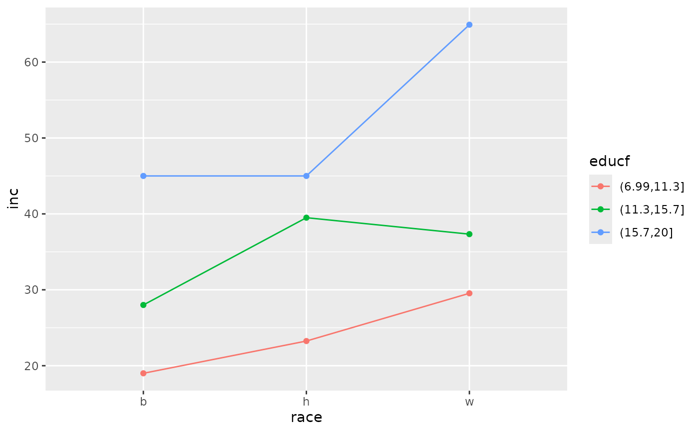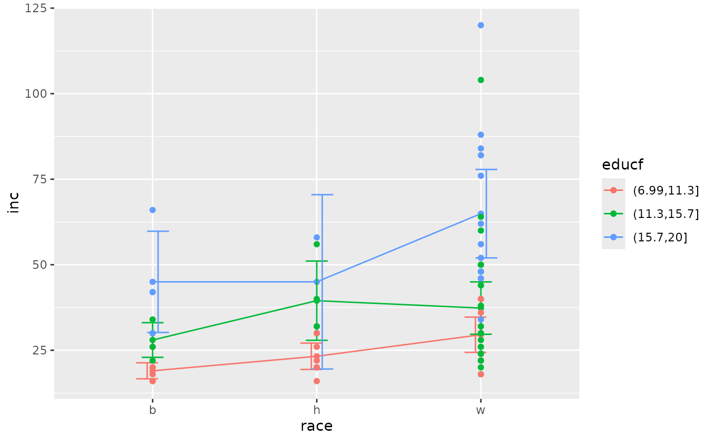 income |> interaction_plot(inc ~ race + educf, interval="conf.int")