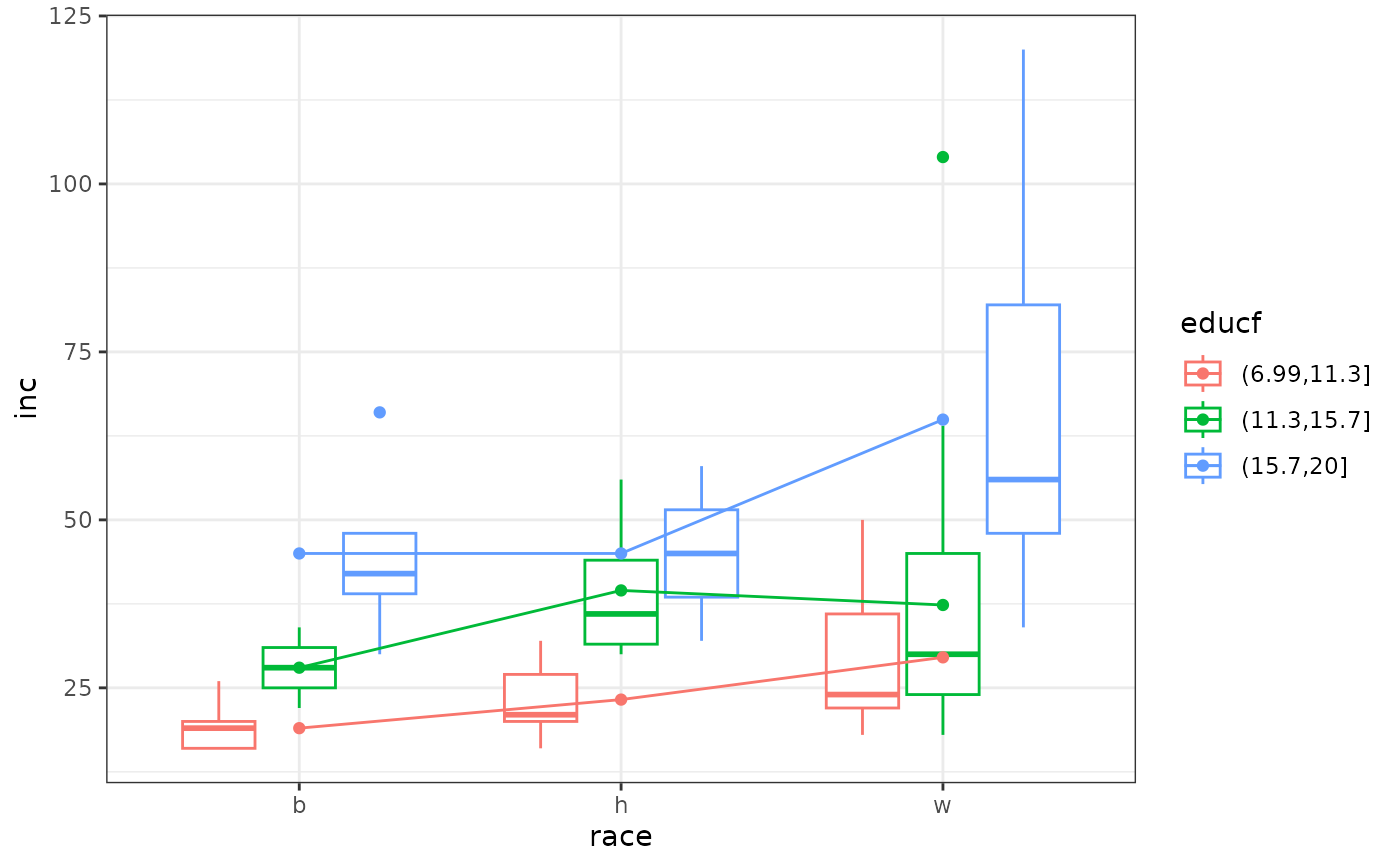 income |> interaction_plot(inc ~ race + educf, interval="boxplot")