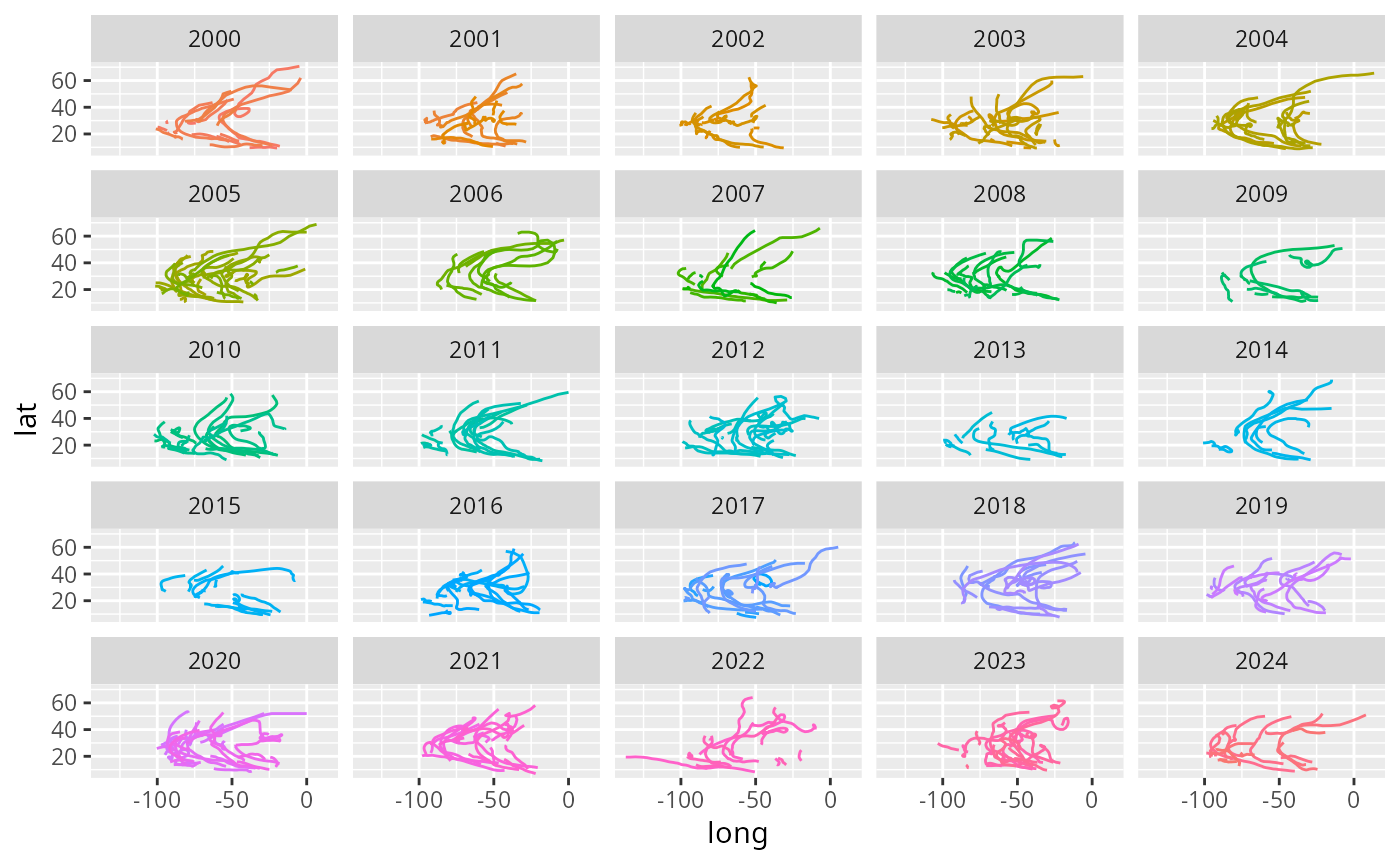 ggplot(aes(long, lat, color = paste(year, name))) +