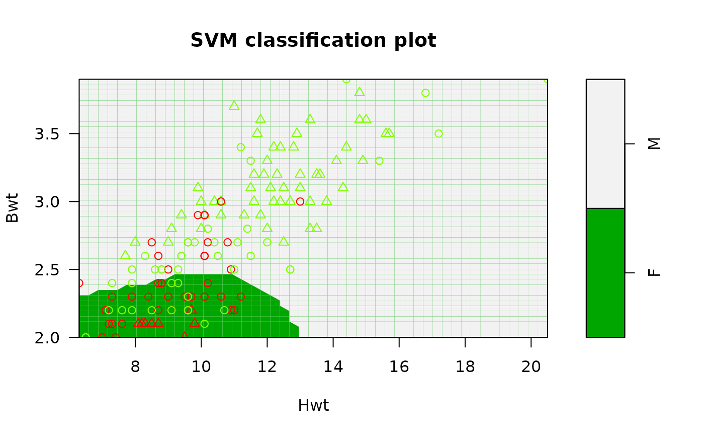 plot(m, cats, svSymbol = 1, dataSymbol = 2, symbolPalette = rainbow(4),