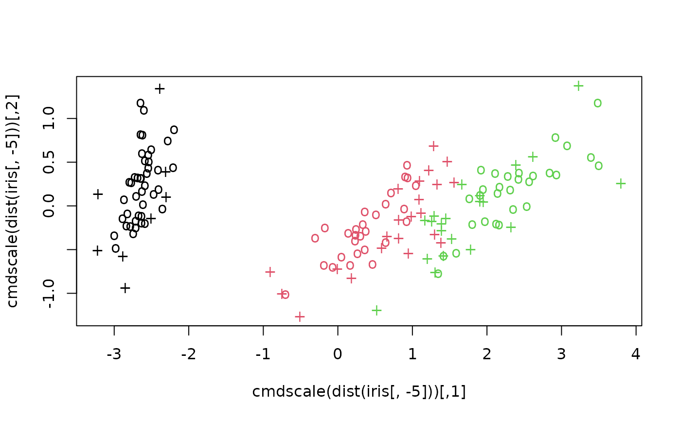 pch = c("o","+")[1:150 %in% model$index + 1])