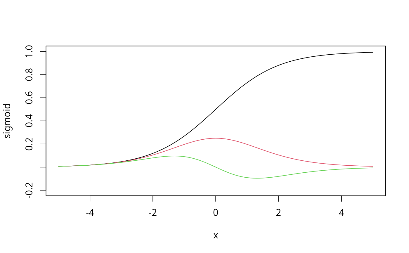plot(sigmoid, -5, 5, ylim = c(-.2, 1)) plot(dsigmoid, -5, 5, add = TRUE, col = 2) plot(d2sigmoid, -5, 5, add = TRUE, col = 3)