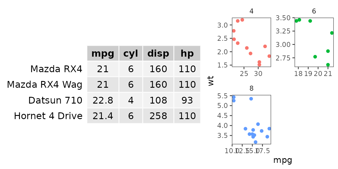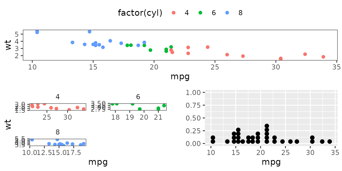 A common request for presenting multiple plots on a single page is to align the plot panels. Often, facetting the plot solves this issue, with a flexible syntax, and in the true spirit of the Grammar of Graphics that inspired the ggplot2 design. However, in some situations, the various plot panels cannot easily be combined in a unique plot; for instance when using different geoms, or different colour scales.