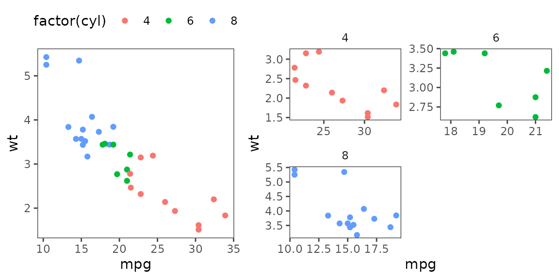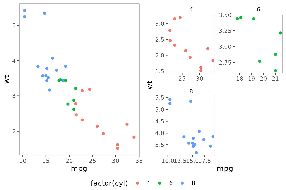 p1 + facet_wrap( ~ carb, nrow = 1) + theme(legend.position = "none") +