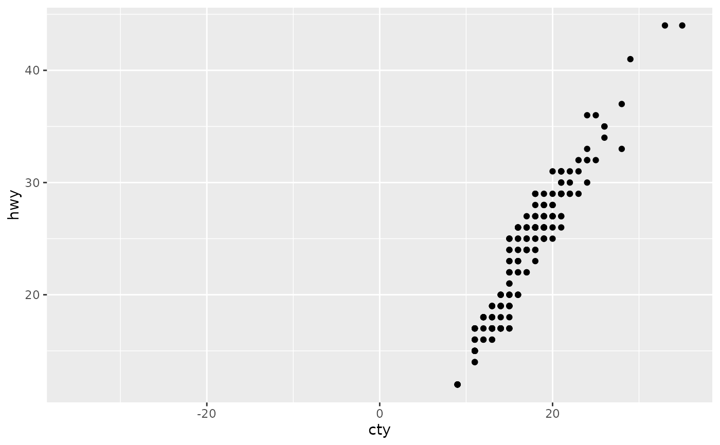 library(ggplot2) ggplot(mpg, aes(cty, hwy)) + geom_point() + scale_x_continuous(limits = symmetric_range)