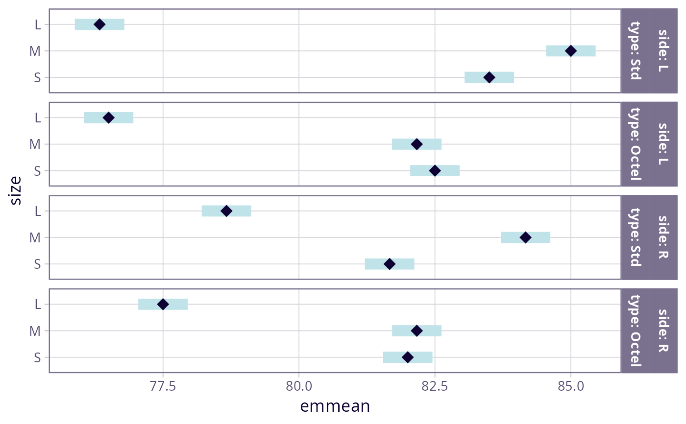 noise.lm <- lm(noise/10 ~ size * type * side, data = auto.noise)