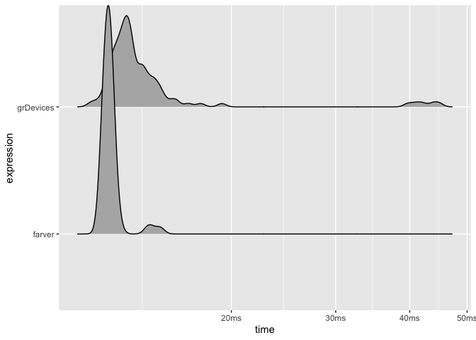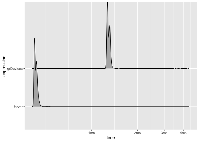 farver is faster than its grDevices counterpart but less so than it was at its first release, as the colour conversion in grDevices has been improved since.