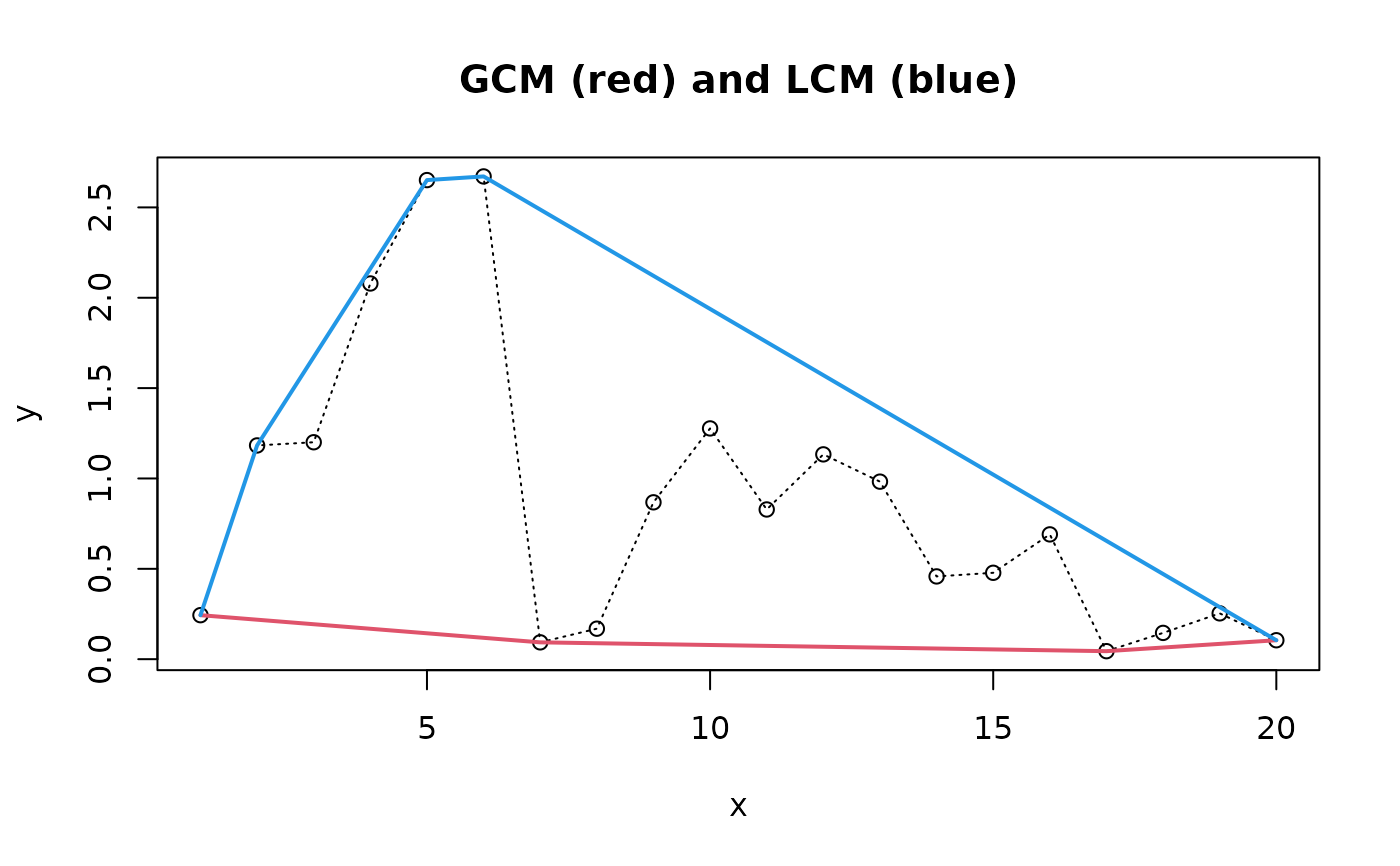 gcmlcm(x, y, type=c("gcm", "lcm"))The GCM is obtained by isotonic regression of the raw slopes, whereas the LCM is obtained by antitonic regression. See Robertson et al. (1988).