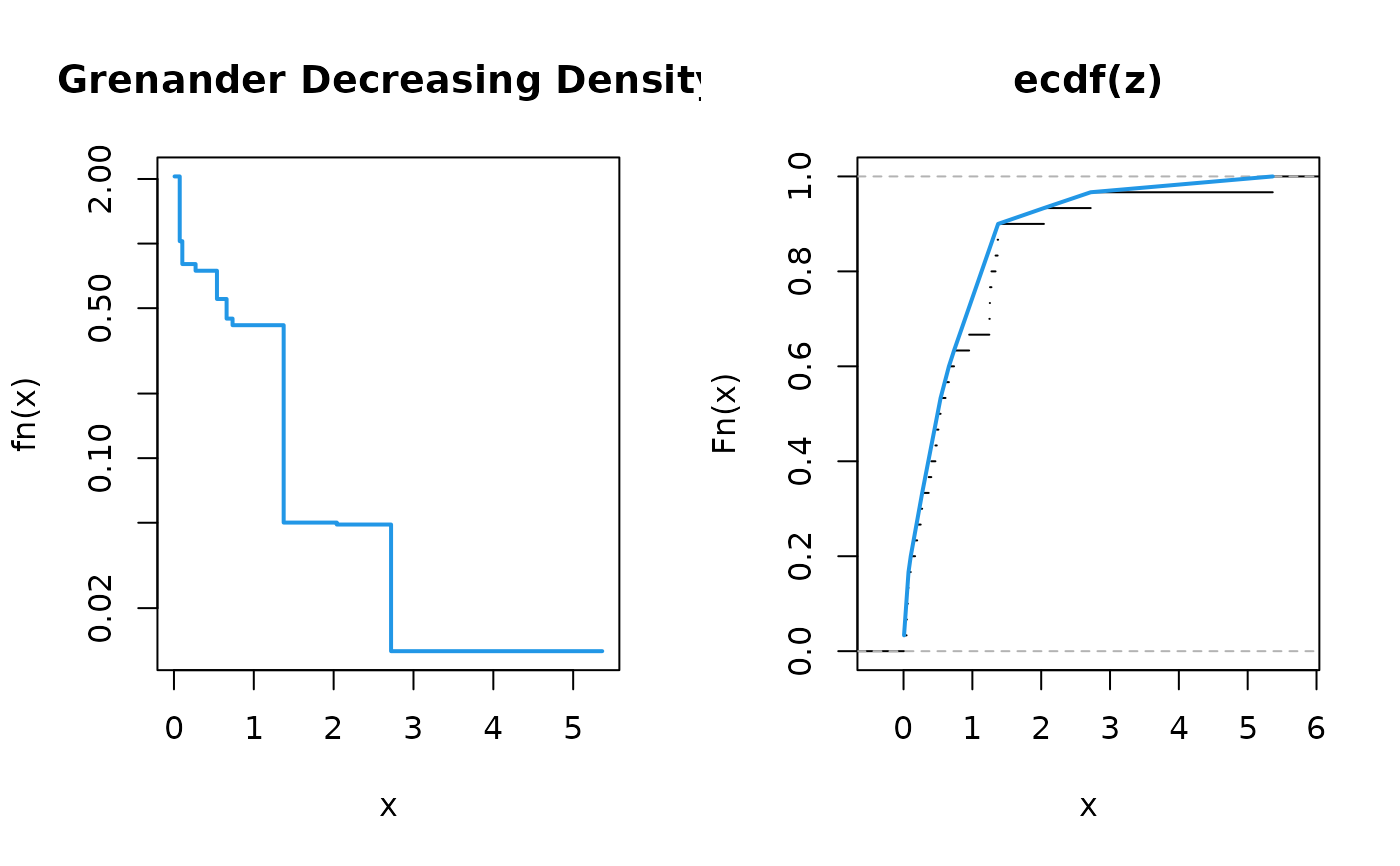 grenander(F, type=c("decreasing", "increasing"))an ecdf containing the empirical cumulative density.