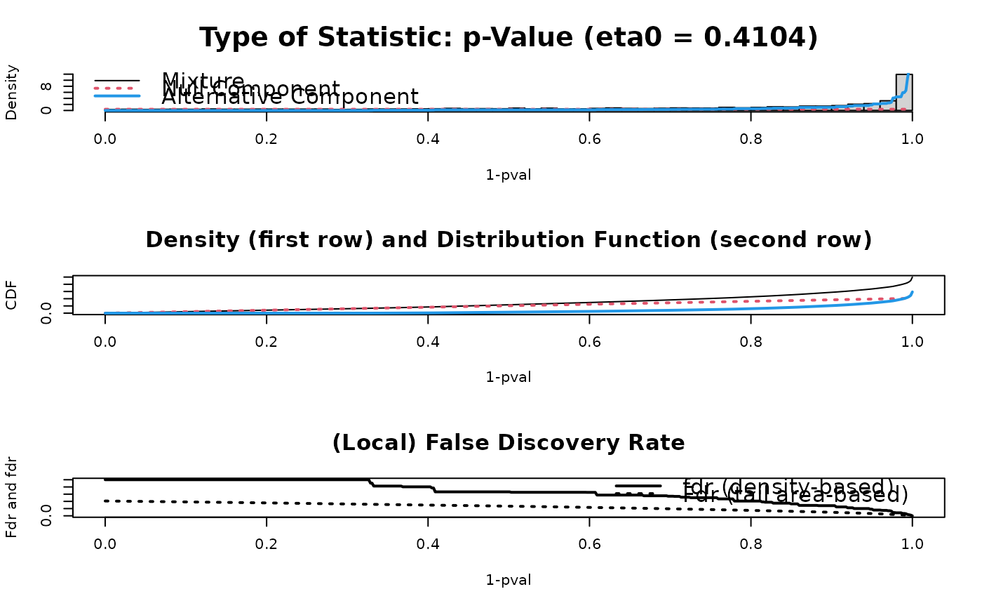 #> Step 3... compute p-values and estimate empirical PDF/CDF