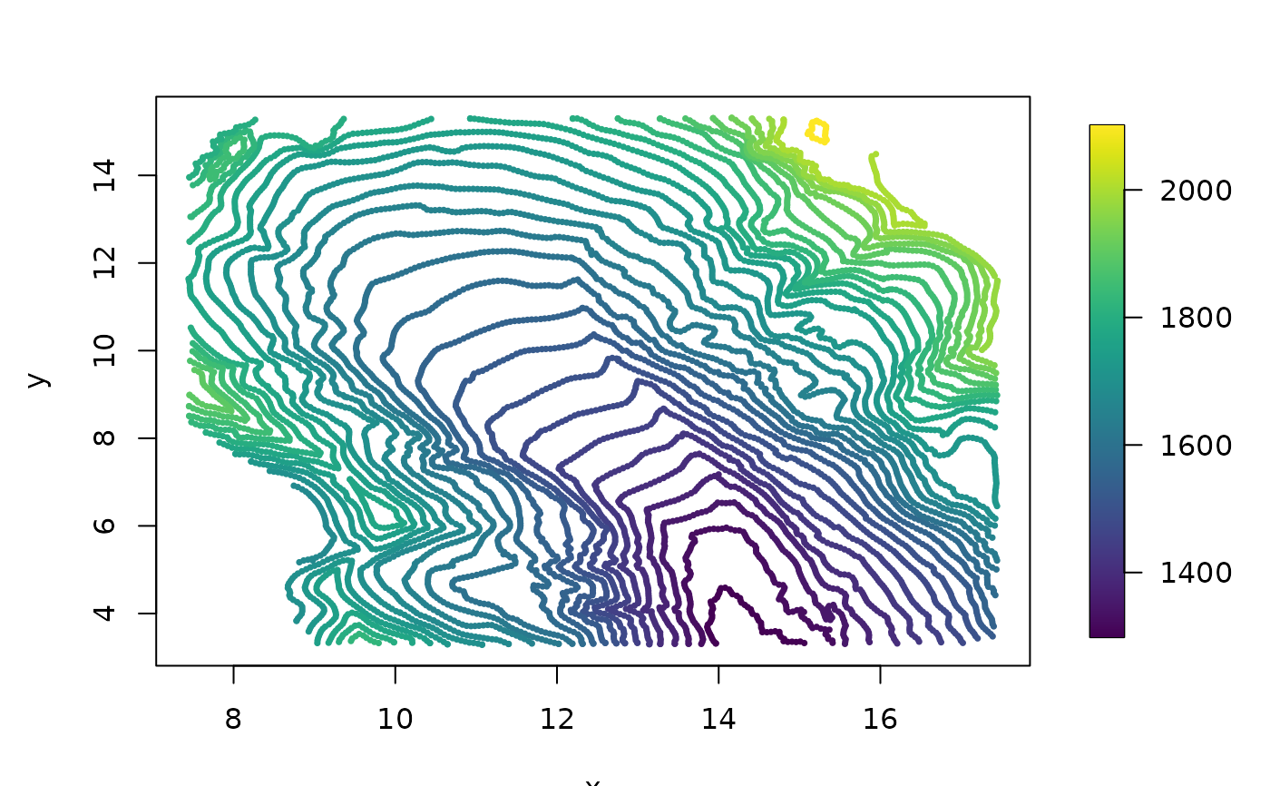 Unfortunately at this time we can not find any background on where these data were collected or indeed even the location of this glacier. However, it is an interesting data set in that it appears that the elevations are reported along lnes of equal elevation, i.e. contours, perhaps from a digitization of a topographic map or survey. It is important to estimate the surface in a way that the artifacts from discretization are not present. In the example below the compactly supported kernel interpolation still has some artifacts.