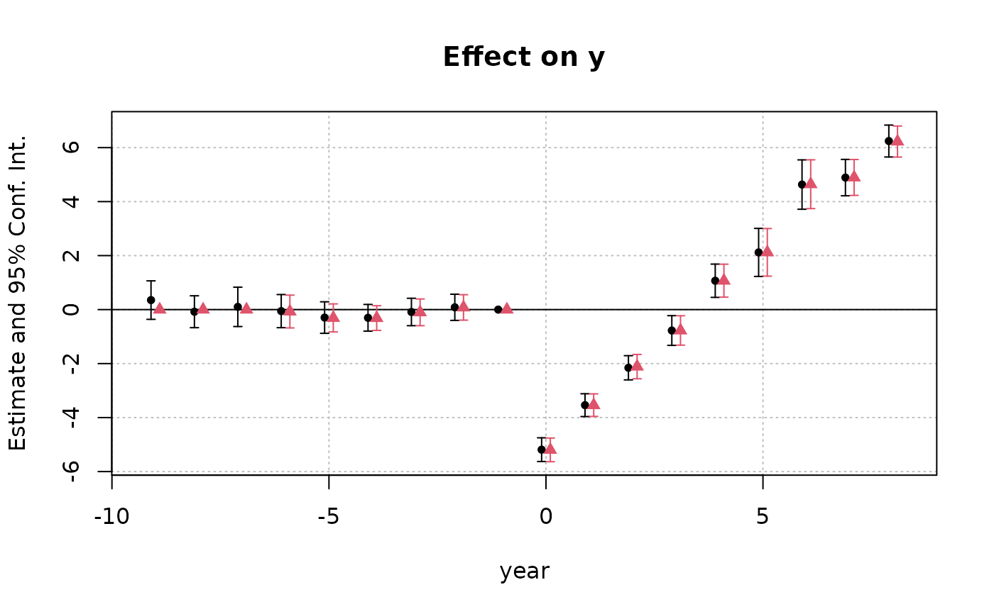 #> year = -7 0.1002 (0.3648) 1.048* (0.4725) 1.046* (0.4713)