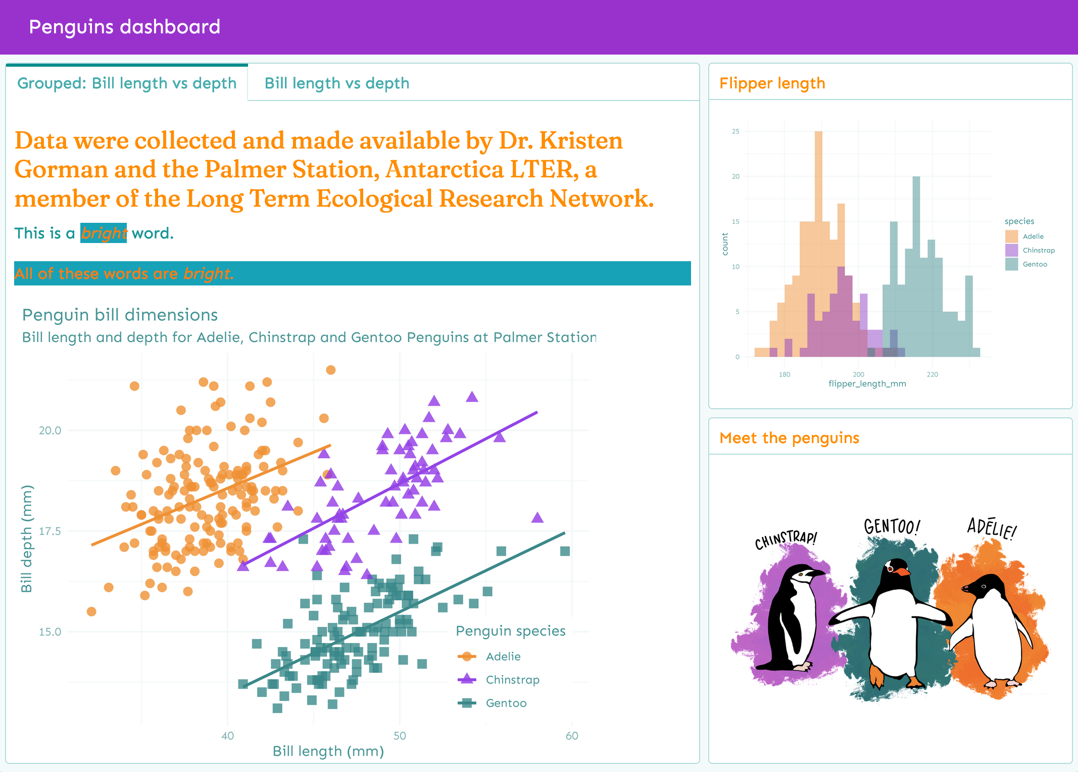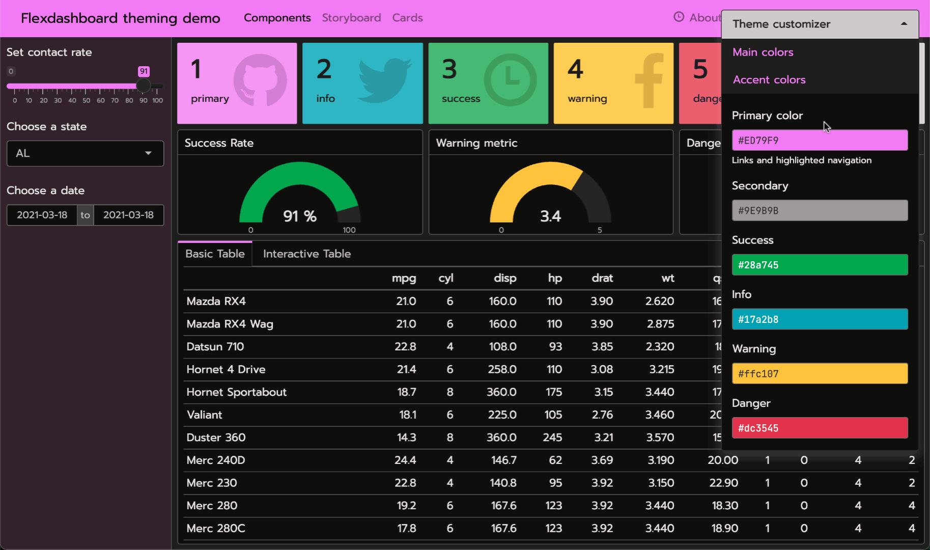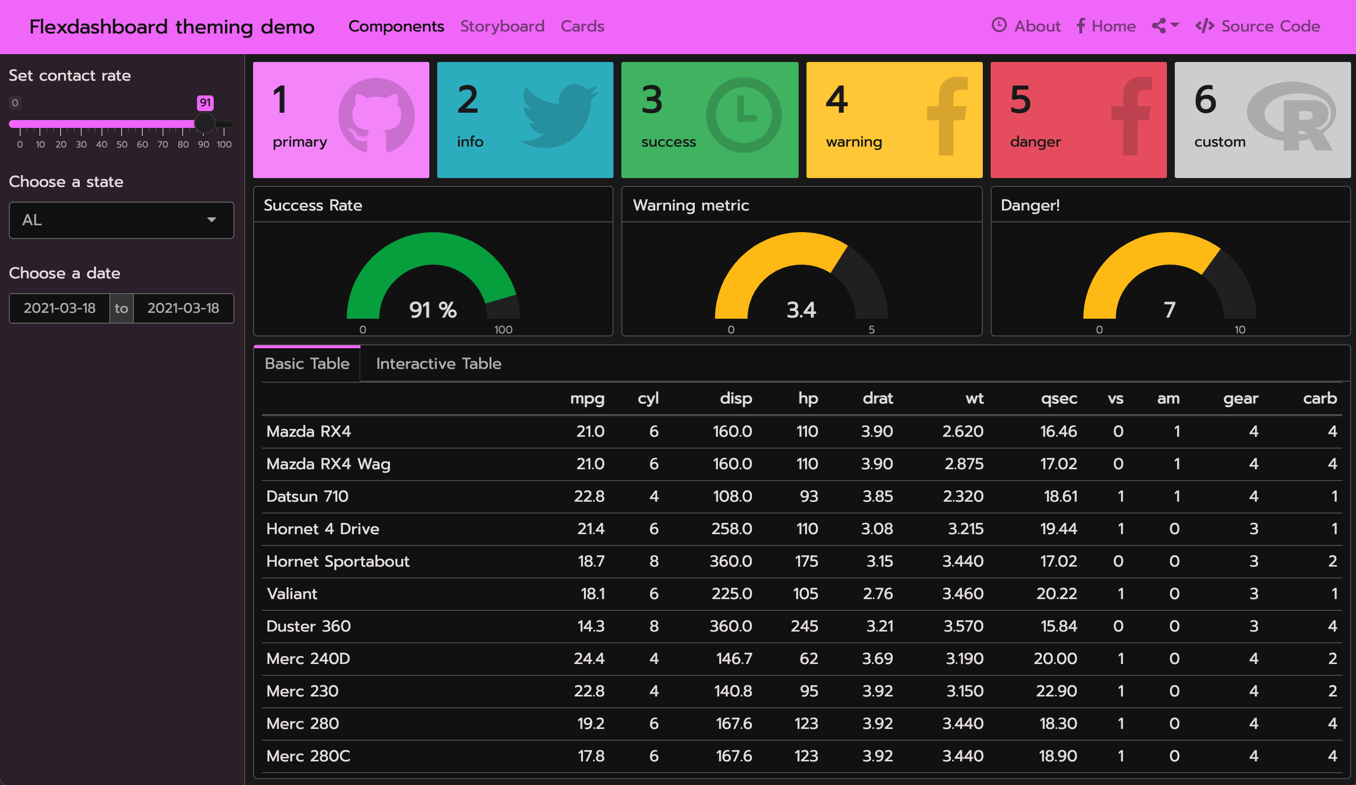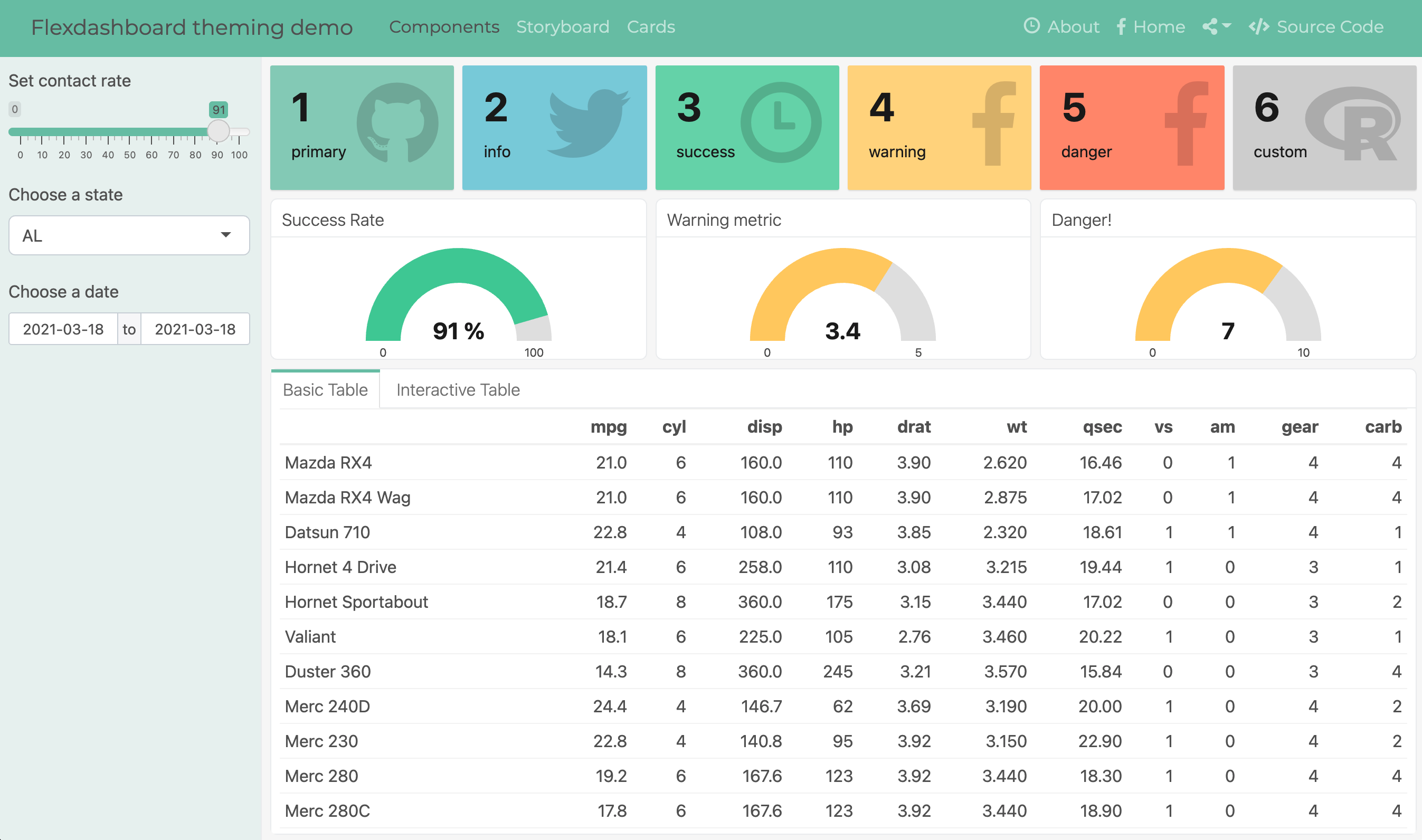 This vignette provides a brief overview of bslib’s integration with flexdashboard, but there’s a lot more to theming with bslib (i.e. Bootstrap Sass), sass (i.e., Sass), and thematic. To learn more, see: