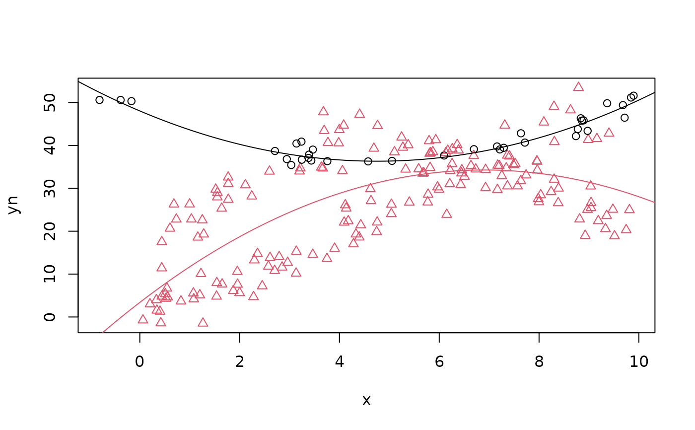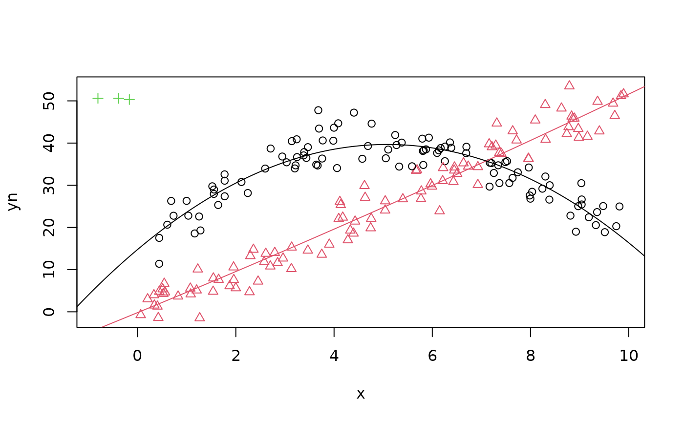 plot(yn ~ x, data = DATA2, pch = 4 - clusters(f3),